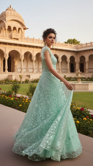 Mint Green Embroidered Ball Gown with Floral Embellishments & Feather Details