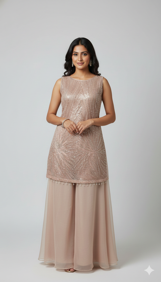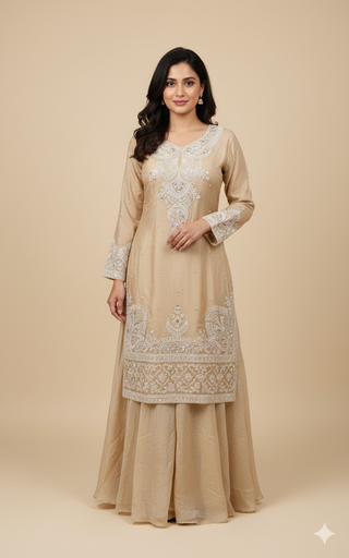 Champagne Beige Sequin Embroidered Sharara Suit Set