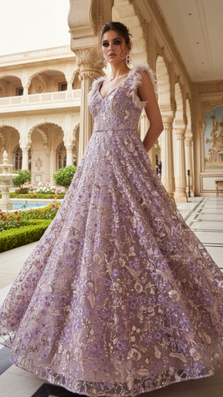 Lavender Embroidered Ball Gown with Floral Embellishments & Feather Details