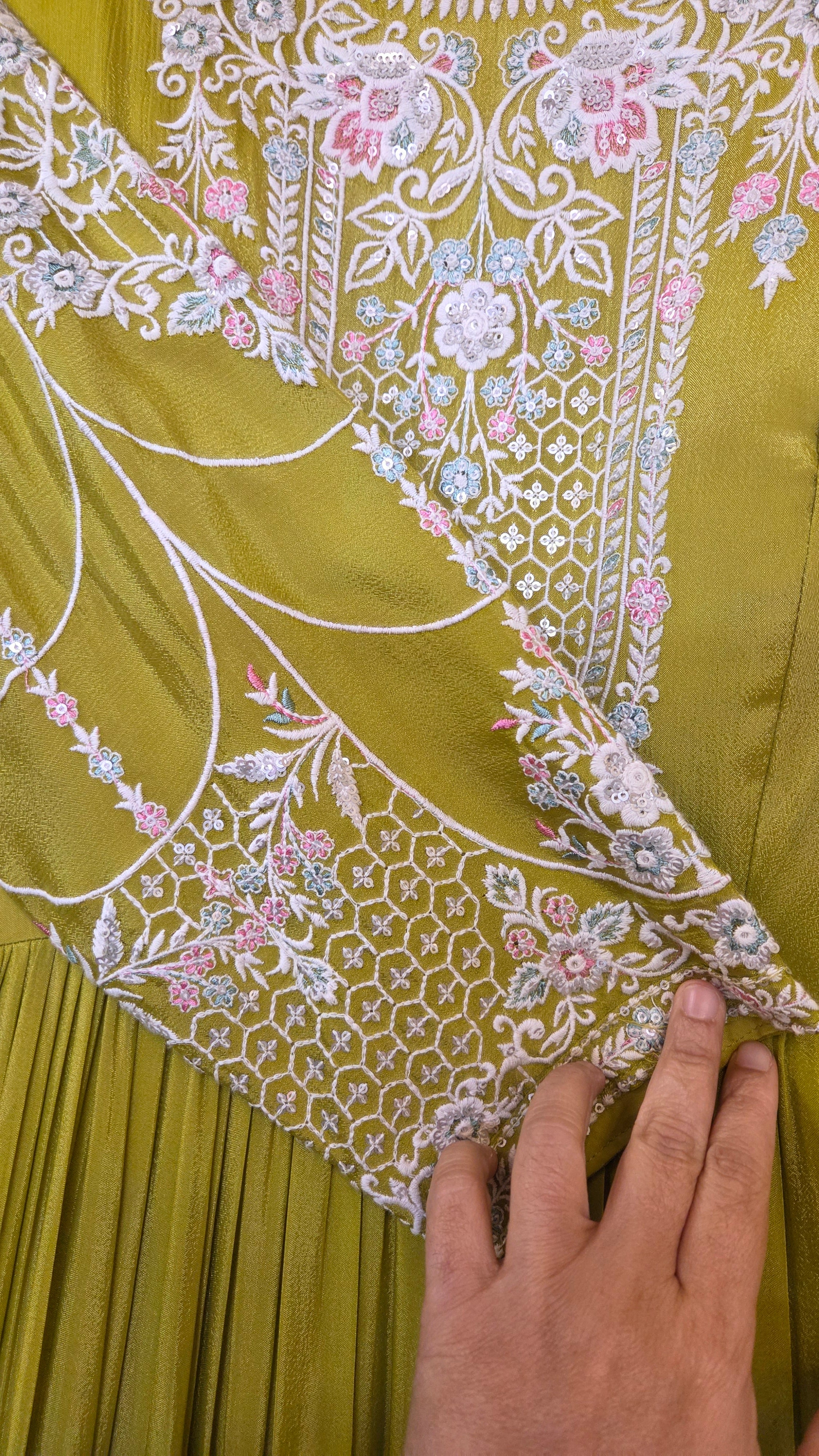 Make an unforgettable entrance in this breathtaking chartreuse green Anarkali gown that perfectly blends traditional Indian craftsmanship with contemporary glamour. Set against the stunning backdrop of Santorini's iconic blue domes, this piece captures the essence of luxury and sophistication.