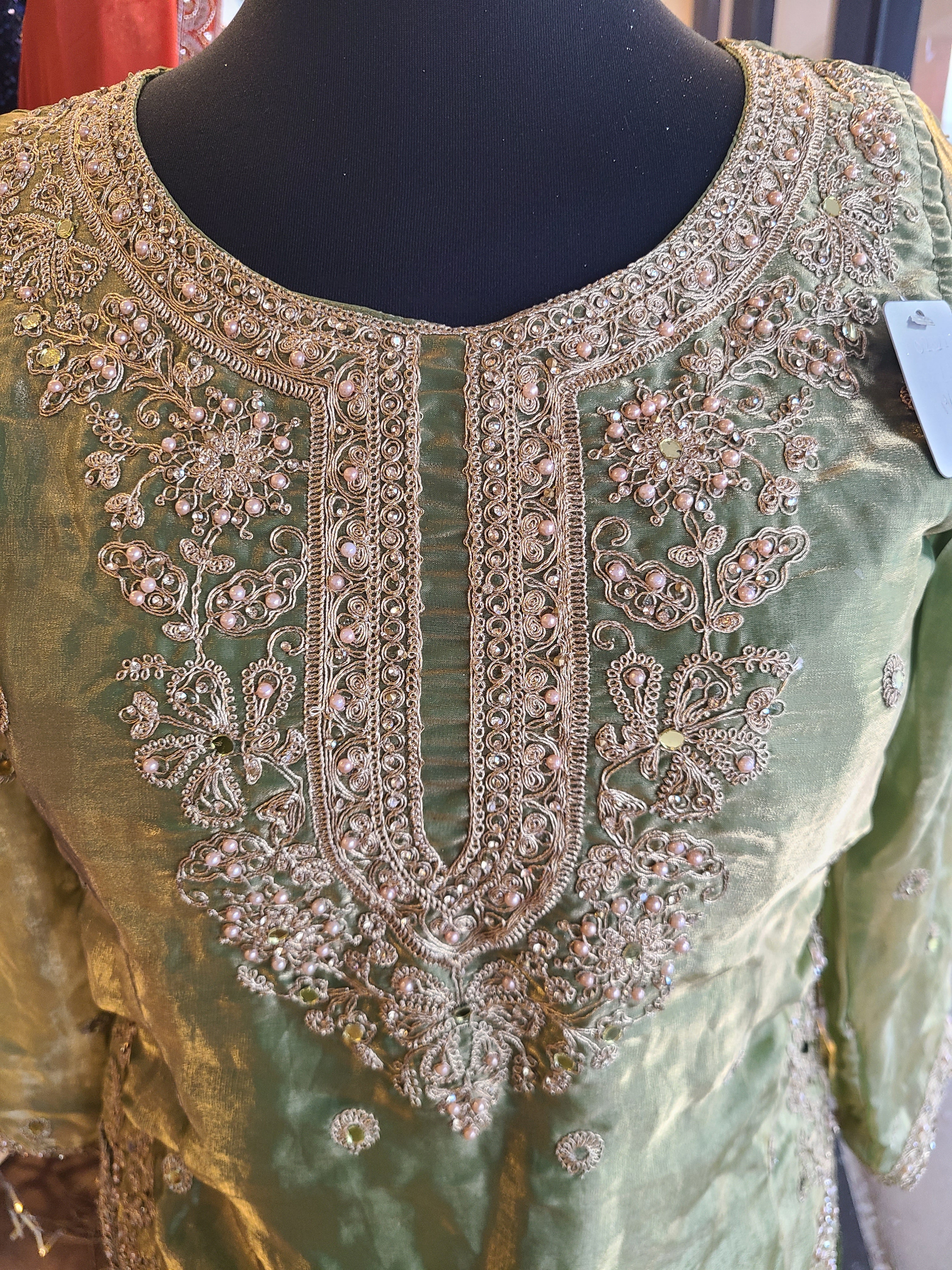 - Dupatta: A coordinating dupatta with an embroidered border and scattered sequin detailing to complete the three-piece look.