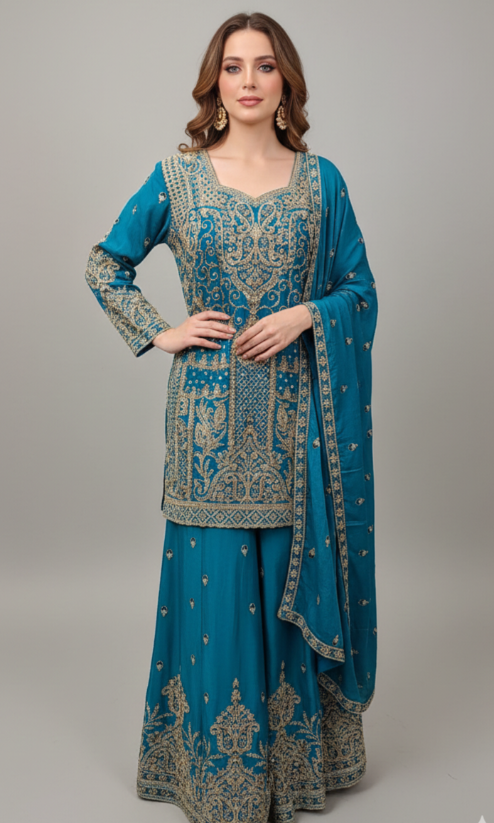 - Sharara: Voluminous, wide-legged flared pants featuring matching heavy embroidery along the hem to create a majestic and balanced silhouette.