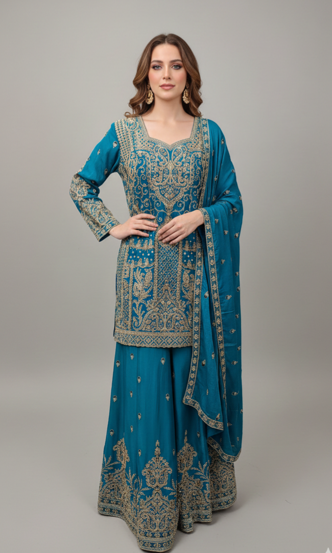 - Kurta: A regal straight-cut shirt meticulously adorned with intricate gold zari, heavy thread work, and shimmering sequin embroidery across the bodice and sleeves.
