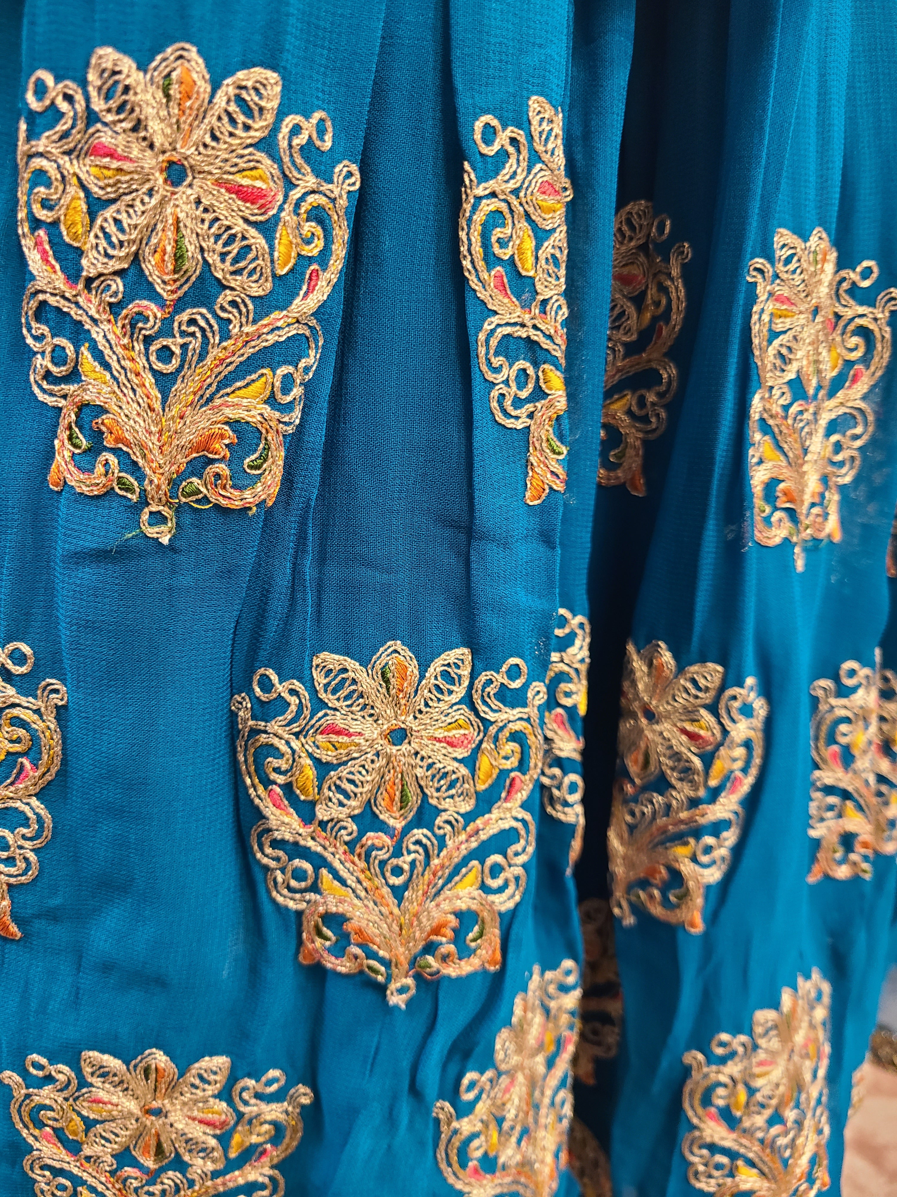 - Embroidery: Hand-embroidered silver and gold threadwork with sequins and intricate detailing