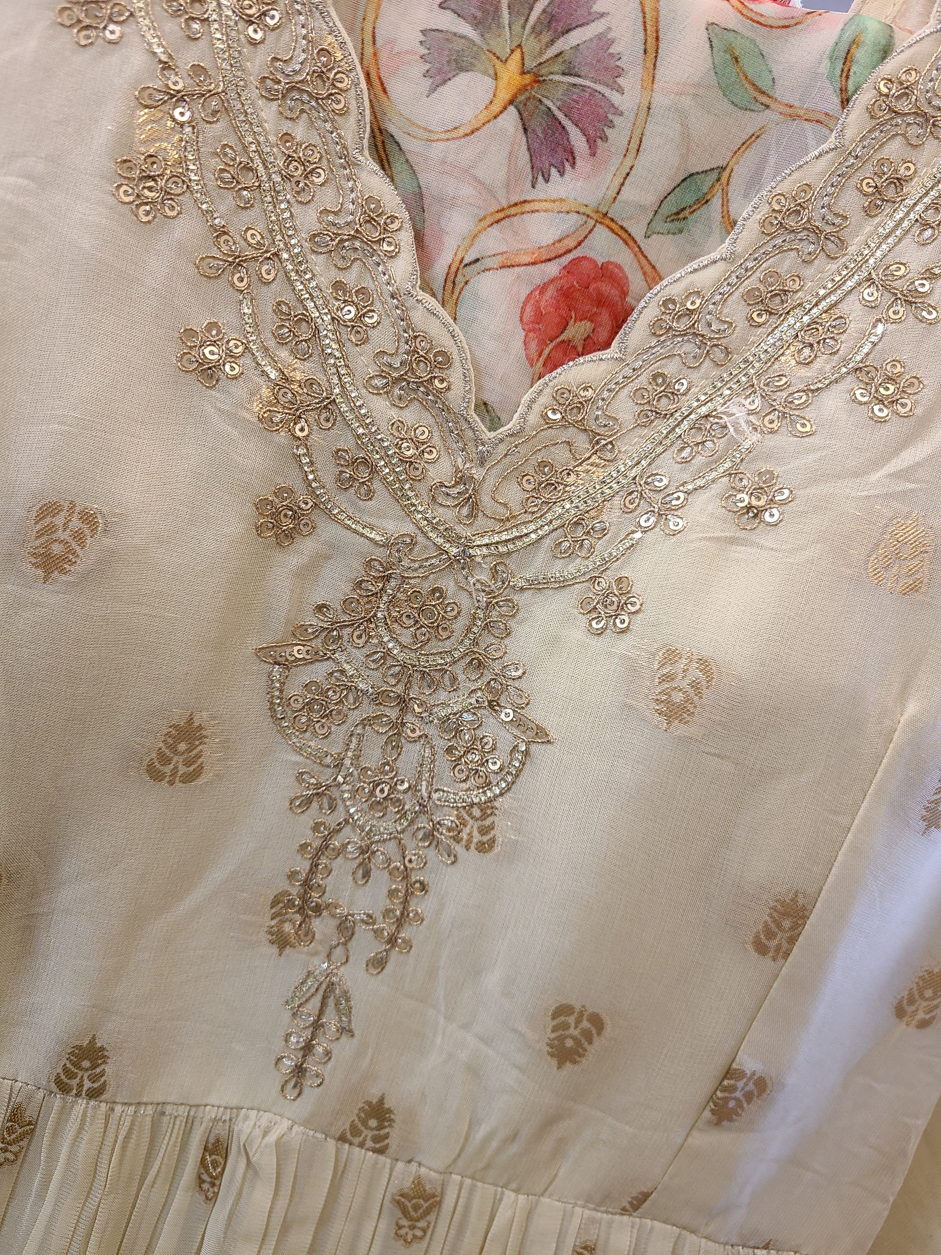 This ivory Anarkali ensemble represents the perfect balance between traditional craftsmanship and contemporary sophistication. The soft color palette allows the intricate embroidery and beautiful silhouette to shine, creating a look that's both memorable and refined. The flowing dupatta adds movement and drama, while the delicate embellishments catch the light with every step.