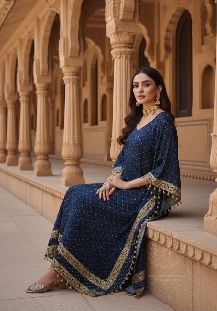 Step into sophistication with this breathtaking navy blue kaftan dress that epitomizes timeless elegance. The rich midnight blue fabric serves as the perfect canvas for intricate golden embellishments that catch the light beautifully, creating an enchanting shimmer with every movement.