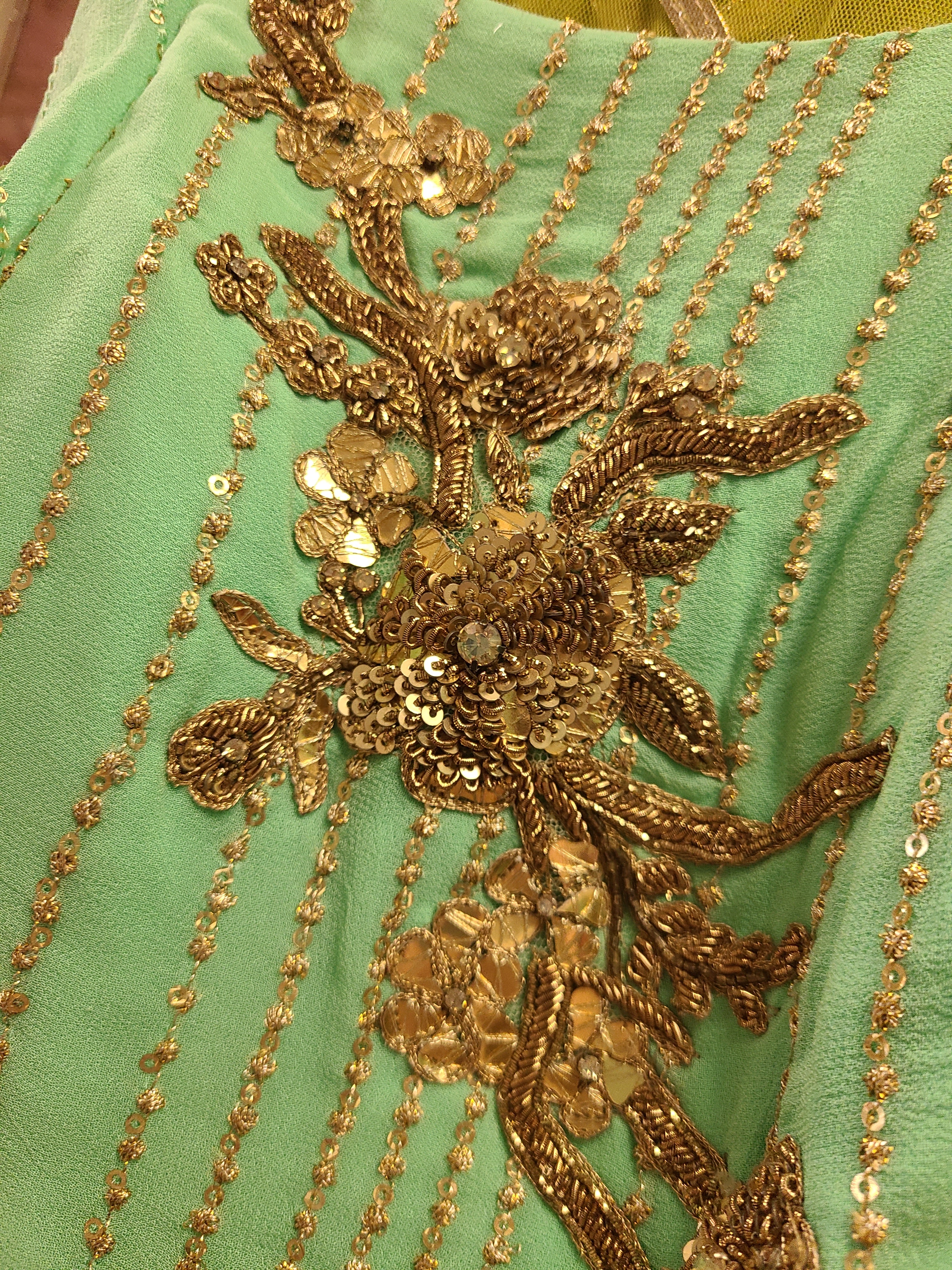 The delicate floral embroidery on the bodice features a beautiful mix of colors that complement both the turquoise base and olive dupatta. The geometric check pattern on the dupatta adds contemporary flair, while the gota patti border maintains traditional elegance. The overall design strikes a perfect balance between classic and modern aesthetics.