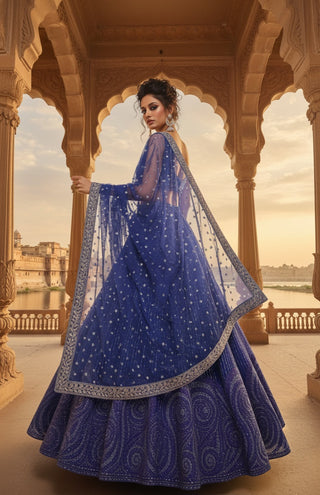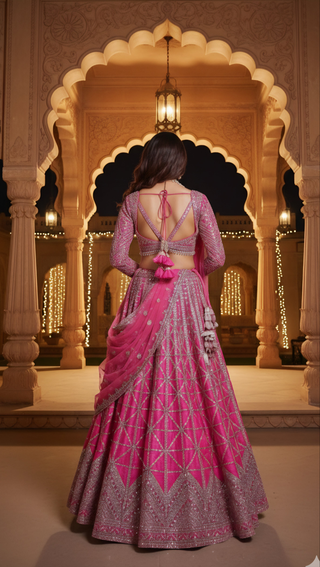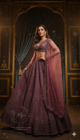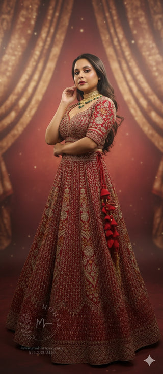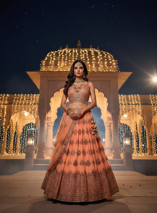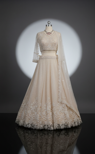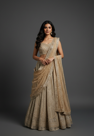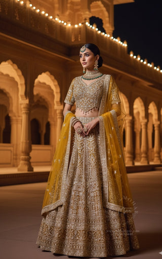 Champagne Gold Embroidered Lehenga Choli with Sleeves - Luxury Bridal Collection