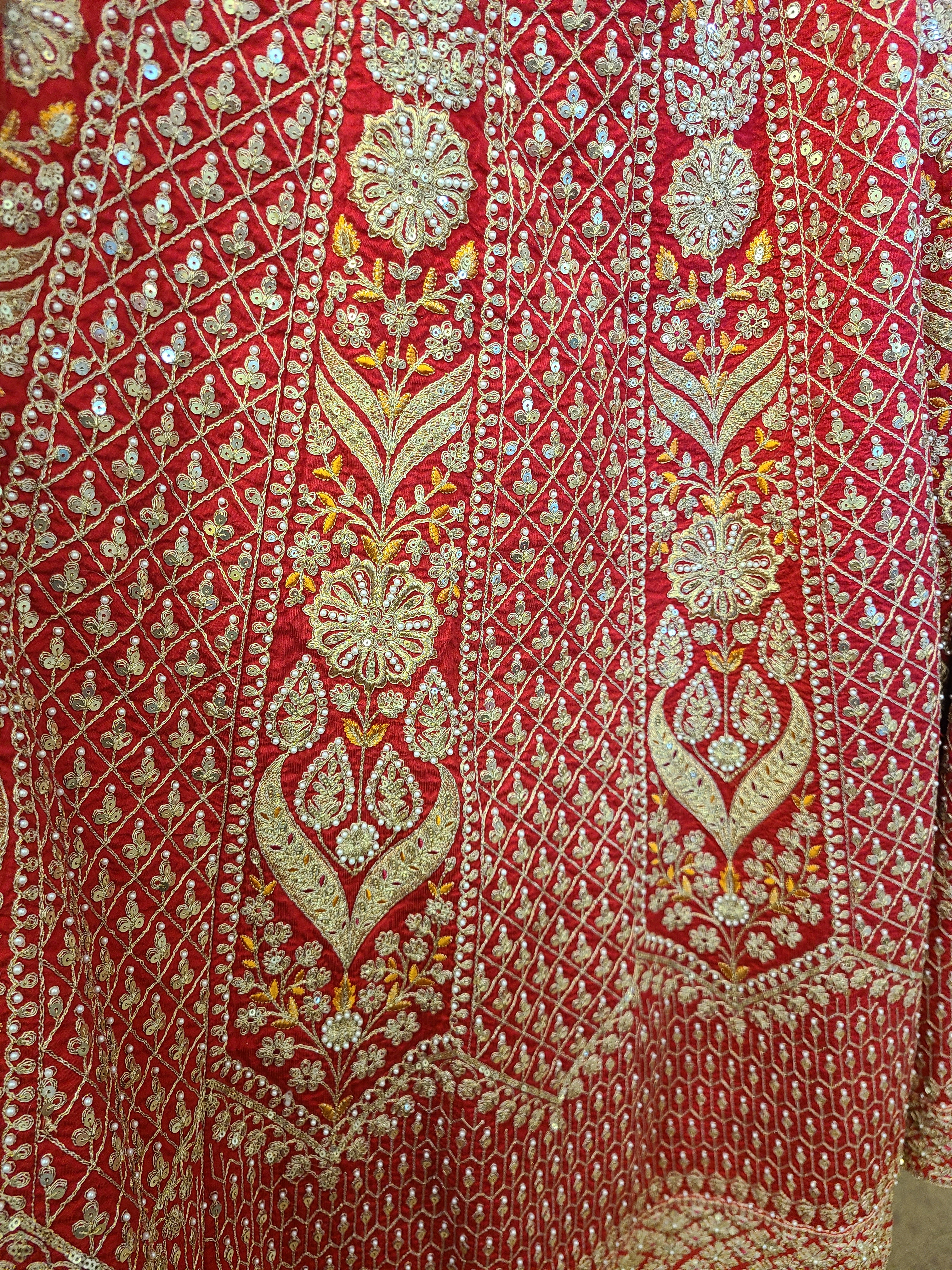 Picture yourself walking down the aisle in this magnificent red creation - the rich color catching the light, the golden embroidery telling stories of love and tradition. This lehenga doesn't just dress you for your wedding; it connects you to generations of beautiful brides who chose red for their most special day.