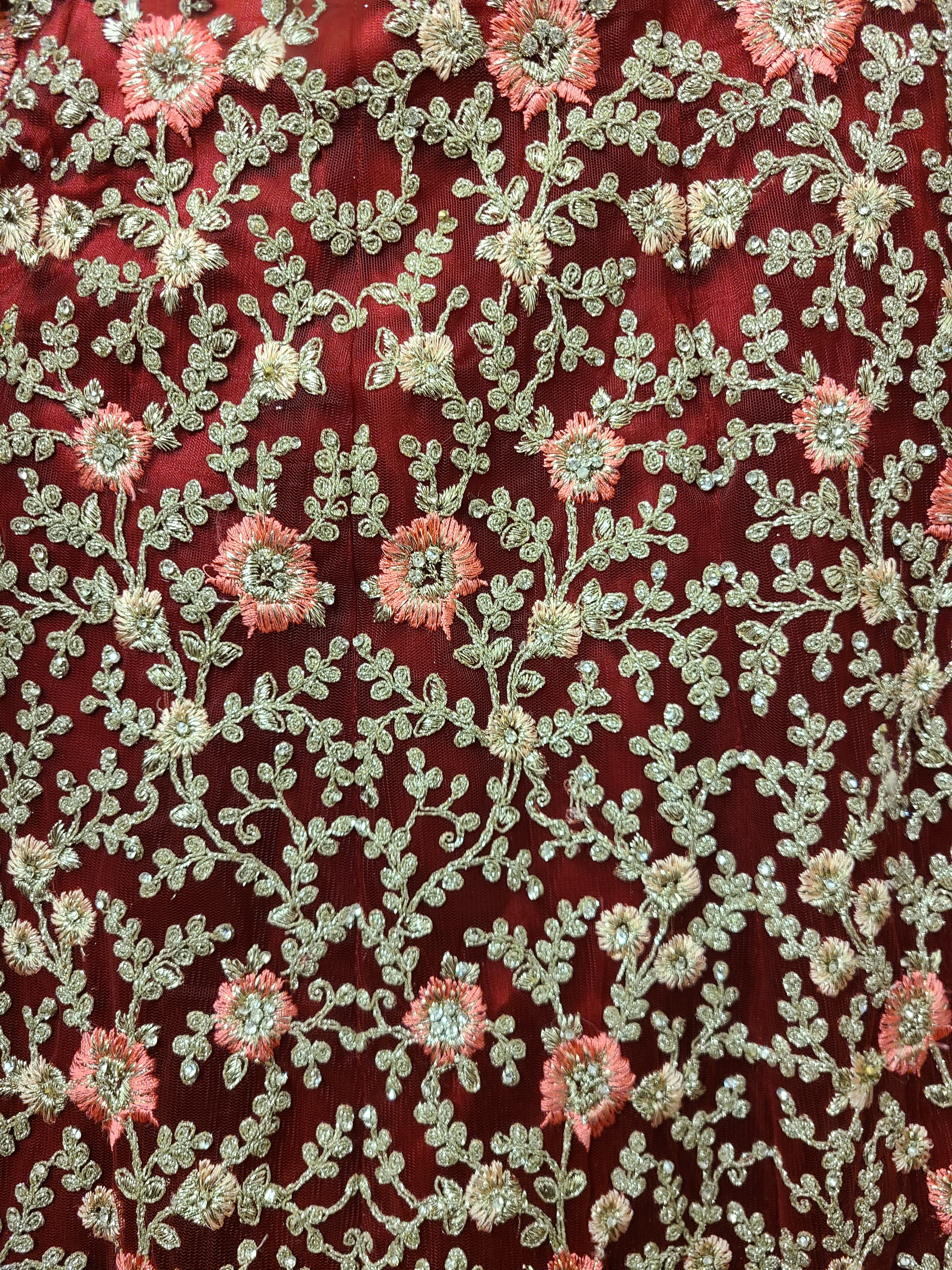 - Matching Dupatta: Lightweight coral-red dupatta with embroidered borders completes the bridal look