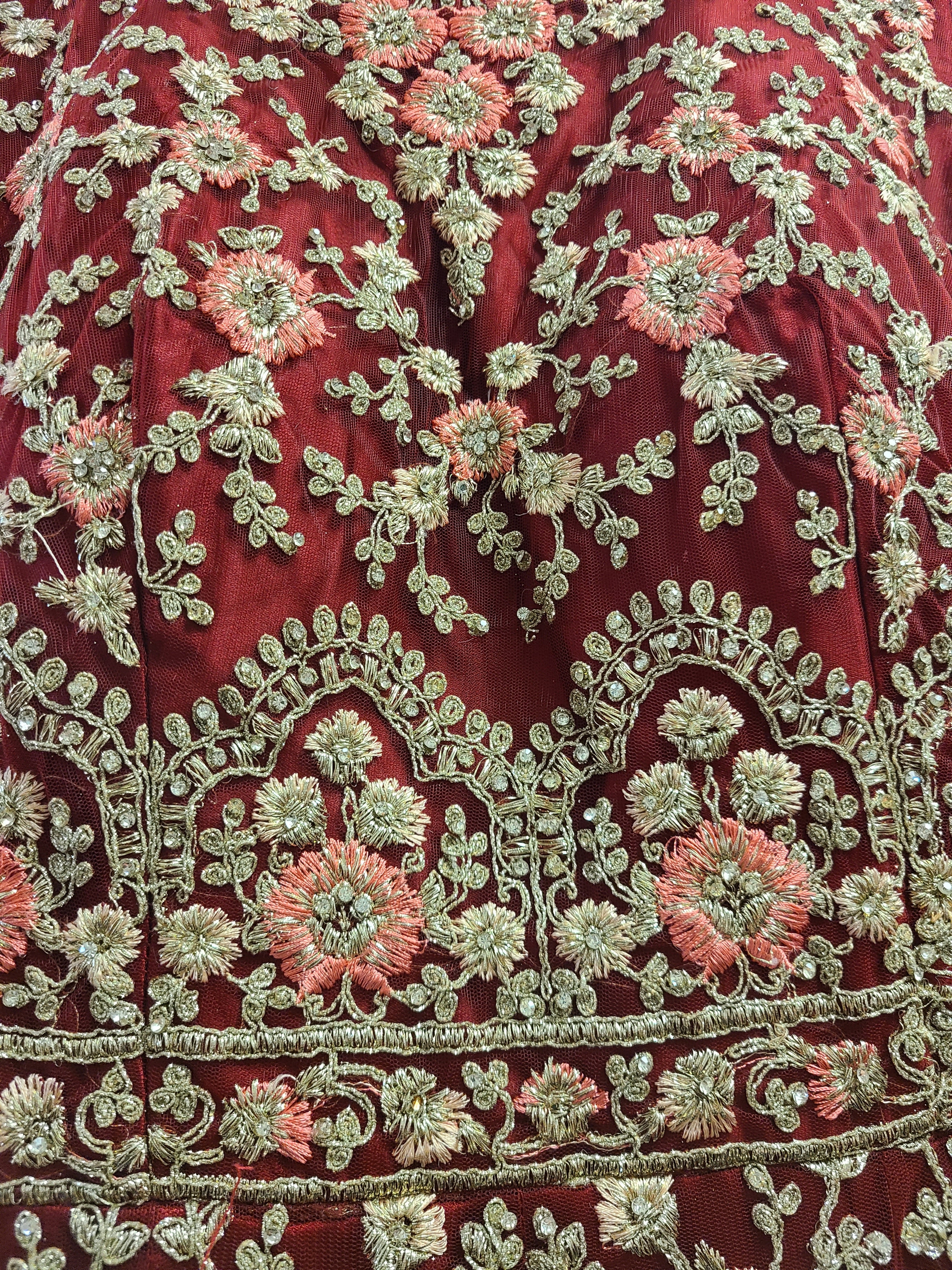 Make your wedding day unforgettable with this magnificent maroon red bridal gown that embodies traditional elegance, regal splendor, and timeless beauty. This breathtaking floor-length ensemble features rich maroon fabric adorned with intricate silver and gold embroidery, creating a majestic look perfect for the bride who wants to honor tradition while making a powerful statement on her special day.