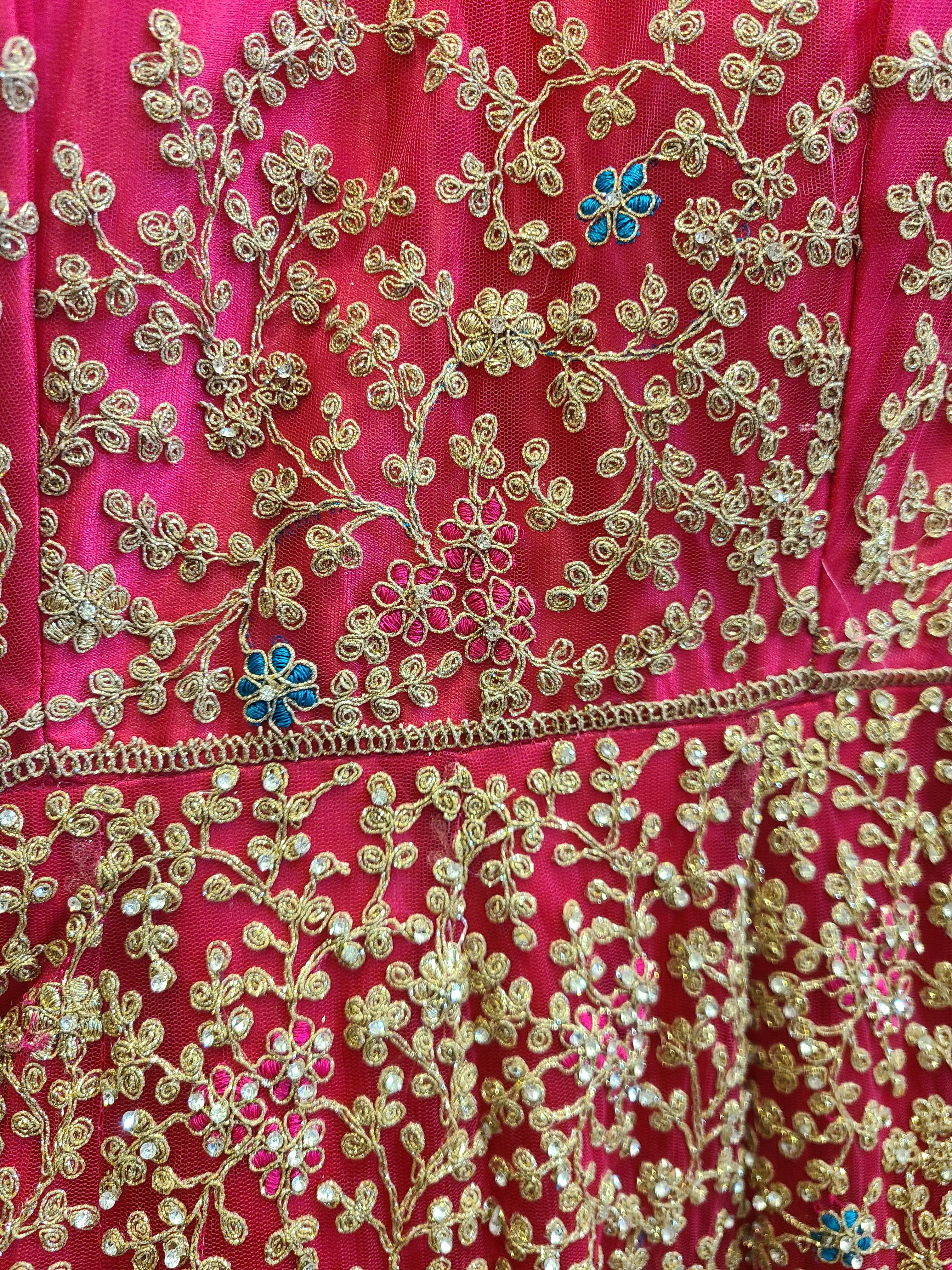 This masterpiece showcases a stunning rich pink base that has been the quintessential bridal color in Indian culture for generations. The floor-length gown features all-over heavy embroidery with intricate gold and silver threadwork, creating a dazzling effect that catches light from every angle. The dense embellishment covers the entire ensemble, making this a true work of art and a statement of bridal grandeur.