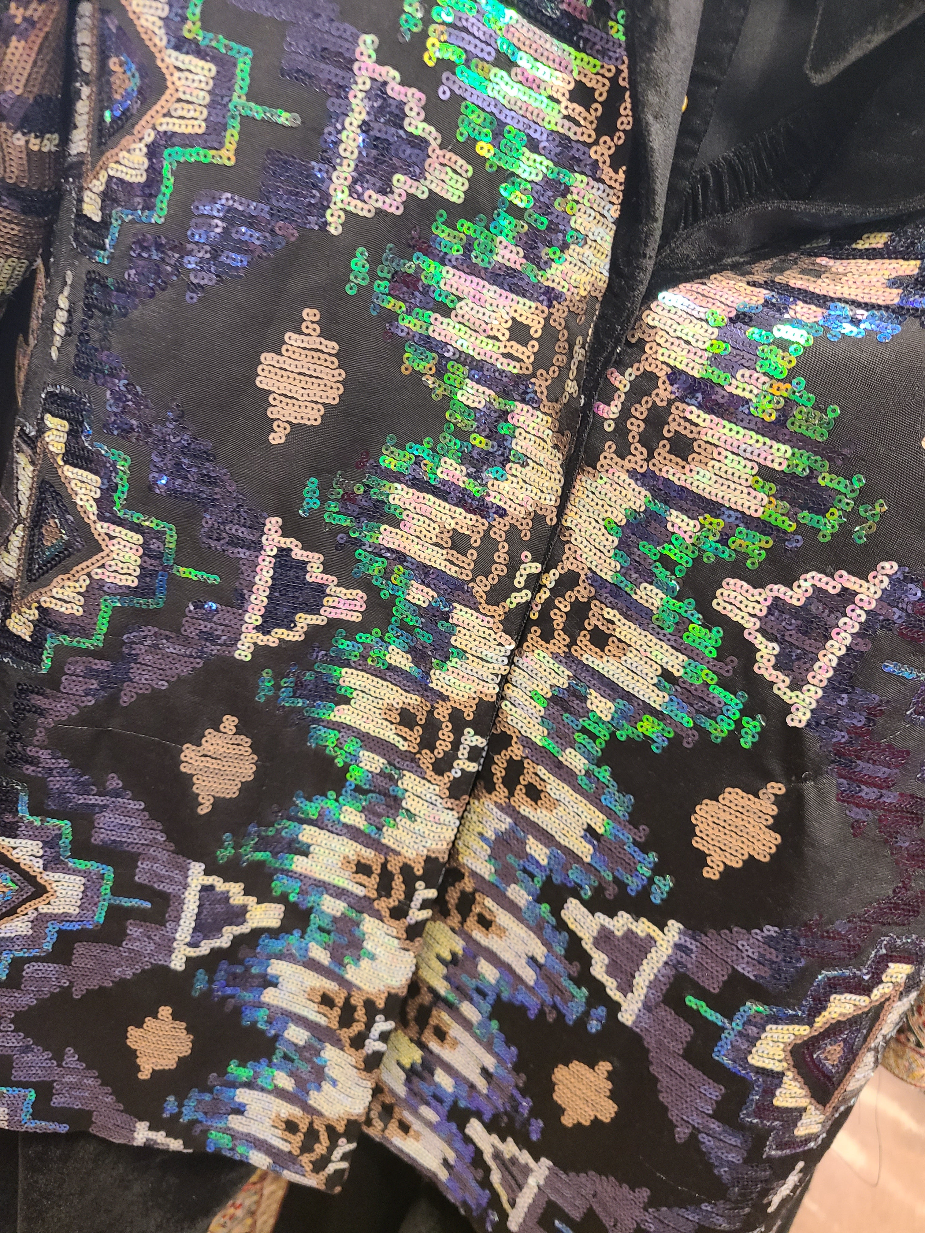 The star of this ensemble is the exquisitely embellished jacket, featuring a mesmerizing pattern of blue, green, and silver sequins that create an abstract, artistic design. The open-front style allows you to showcase the velvet shirt underneath while making a bold statement. Perfect for layering and creating dimension in your look.