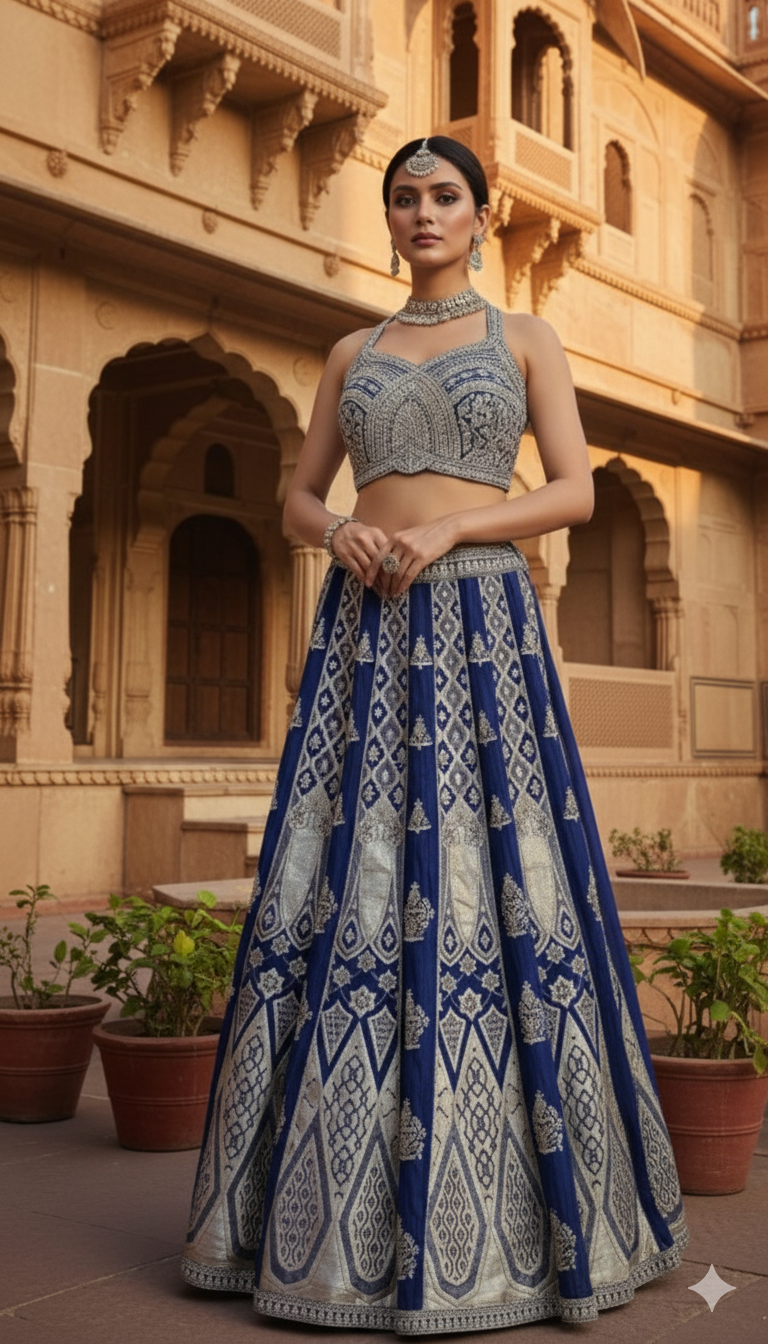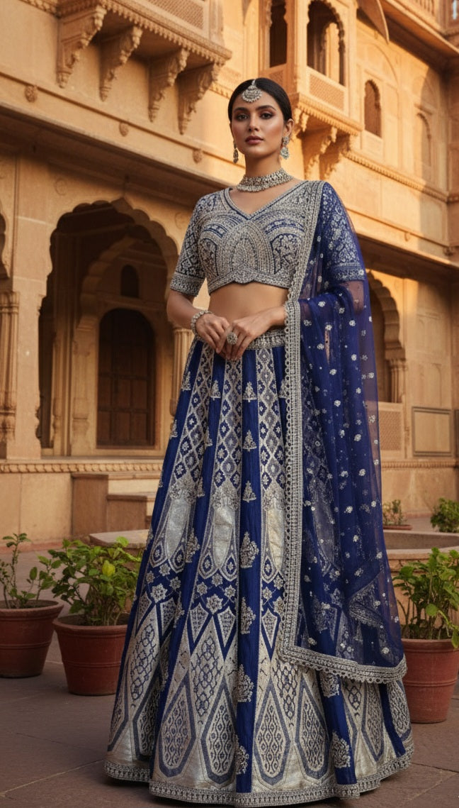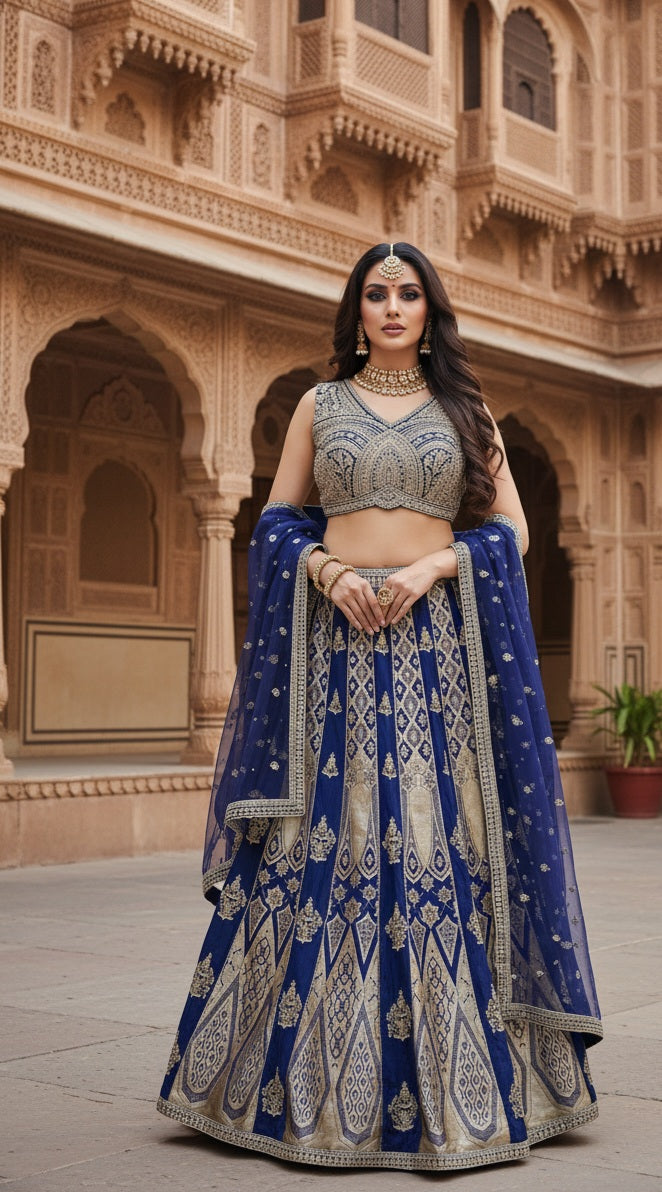 Embrace the grandeur of royalty with this breathtaking royal blue lehenga choli ensemble that showcases the pinnacle of traditional Indian craftsmanship. This luxurious three-piece set is a testament to timeless elegance and sophisticated artistry.