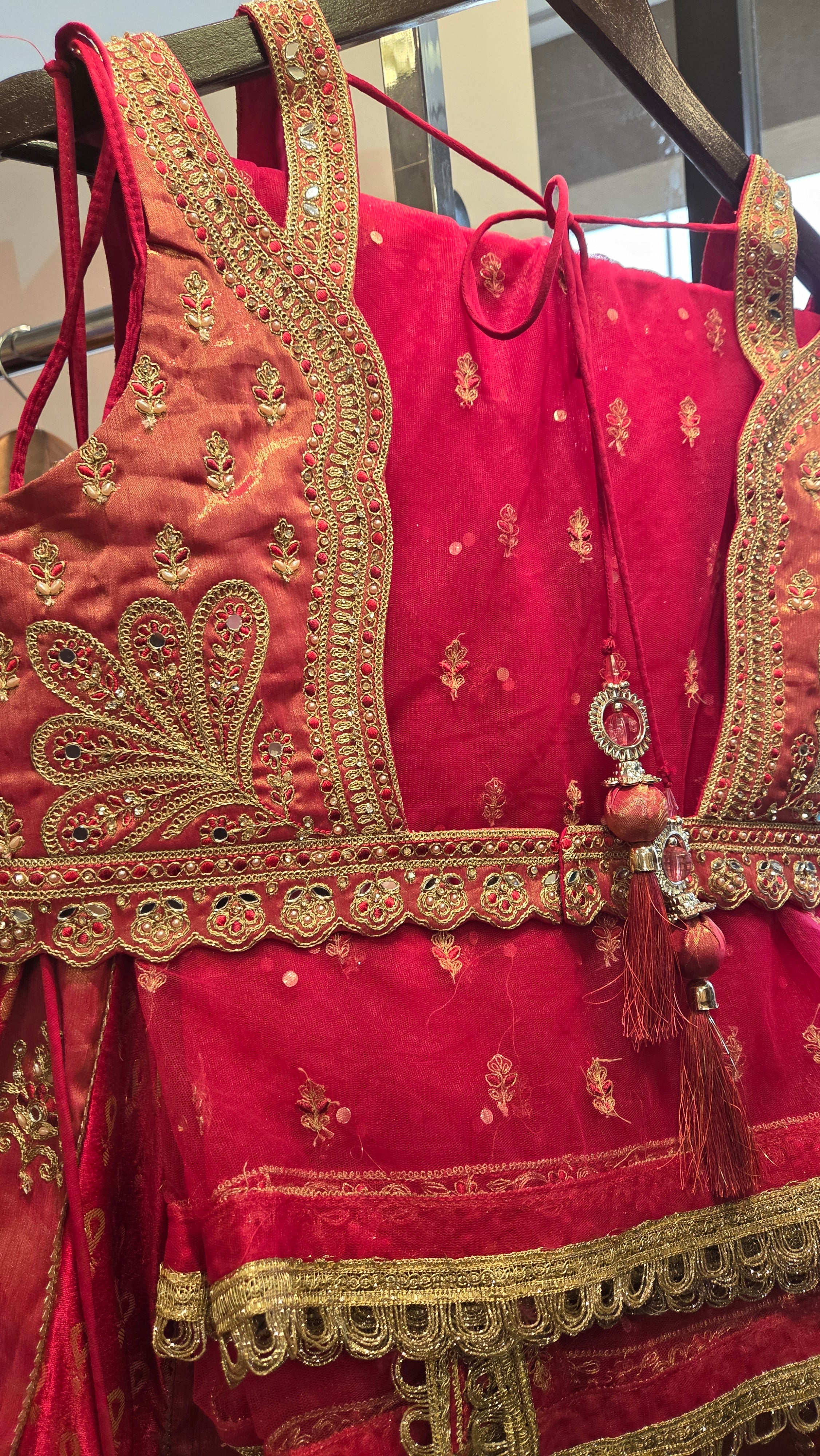 Step into your fairytale moment with this breathtaking Red and Gold Embroidered Bridal Lehenga – a masterpiece that embodies the perfect blend of traditional grandeur and contemporary sophistication. This stunning three-piece ensemble features intricate gold embroidery, luxurious fabrics, and exquisite detailing that will make you feel like royalty on your special day.
