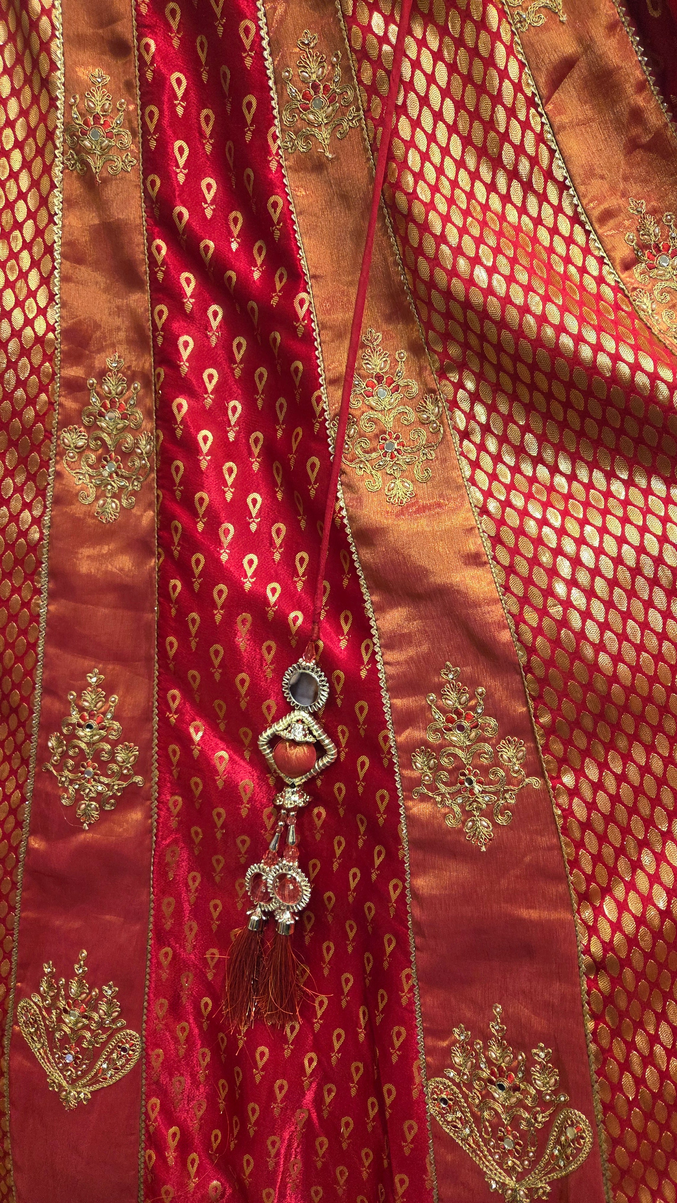- Magnificent Lehenga Skirt: Stunning combination of red and beige panels with heavy gold embroidery, intricate geometric patterns, and floral motifs that create a mesmerizing visual effect
