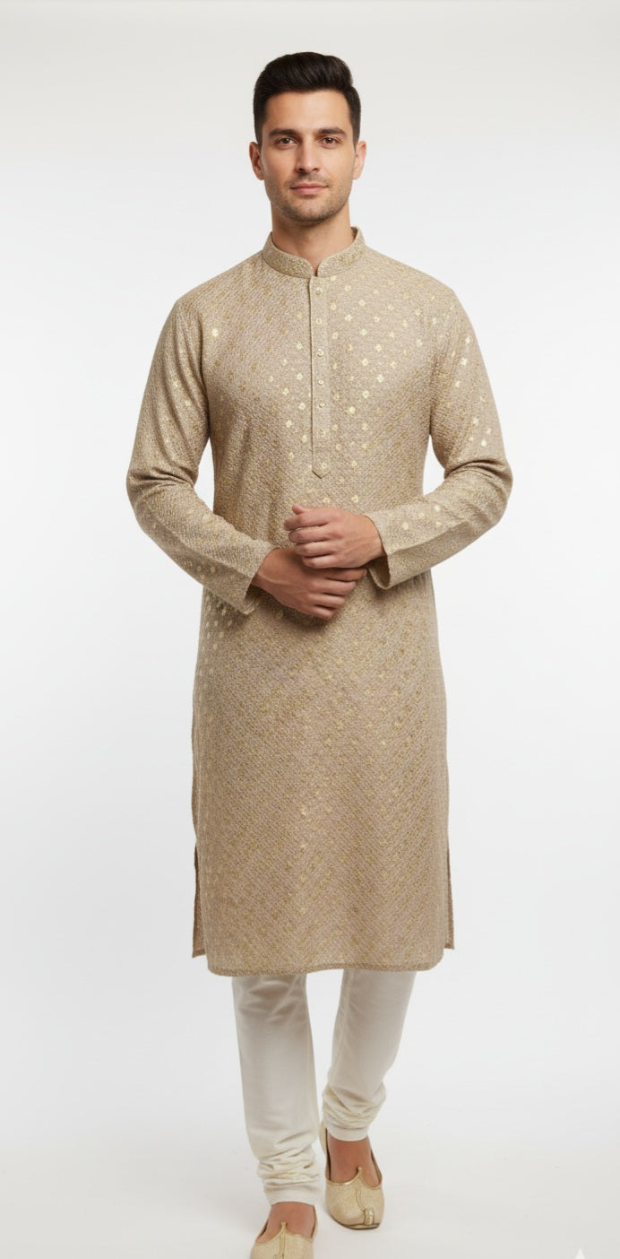 Make a dazzling statement at your next celebration with this exquisite Golden Beige Sequin Embroidered Kurta Set. This luxurious ensemble features all-over sequin work that catches the light beautifully, creating a subtle shimmer that's both elegant and eye-catching. Perfect for the modern gentleman who wants to stand out with refined sophistication.