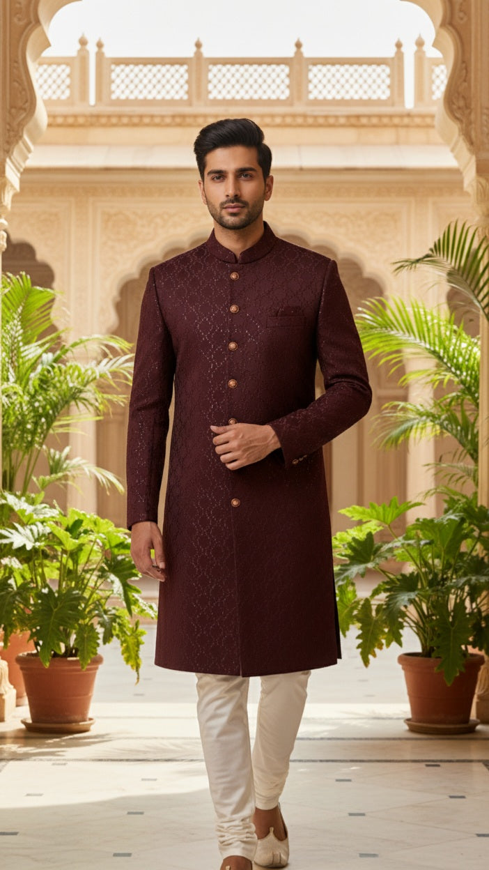 Imagine the confidence that comes from wearing a piece that has been crafted with the same attention to detail as royal garments of ancient India. This sherwani doesn't just dress you - it transforms you into royalty. The interplay of maroon and gold creates a visual symphony that speaks of heritage, luxury, and impeccable taste.