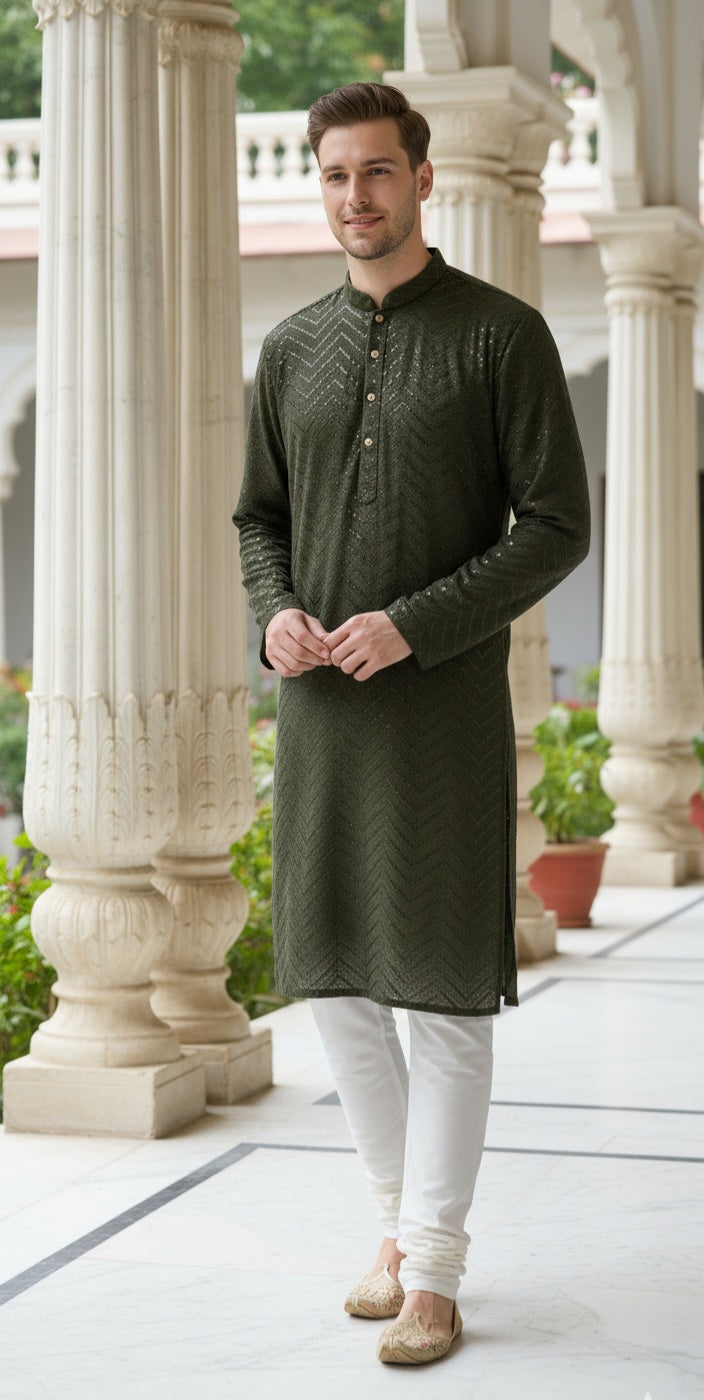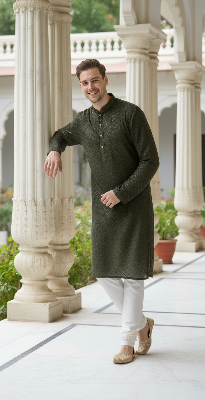 This kurta strikes the perfect balance between formal and festive, making it suitable for both daytime and evening events. The sophisticated olive green color and intricate embroidery make it appropriate for main wedding events, while the comfortable fit ensures you can wear it for hours without discomfort. The modern color choice makes it perfect for the fashion-forward gentleman who wants to stand out from traditional reds and golds.