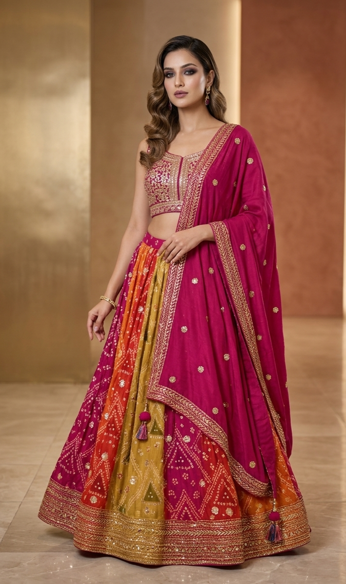 - Lehenga: Fully flared bandhani skirt in rani pink, orange & mustard with heavy zari border and sequin embellishment