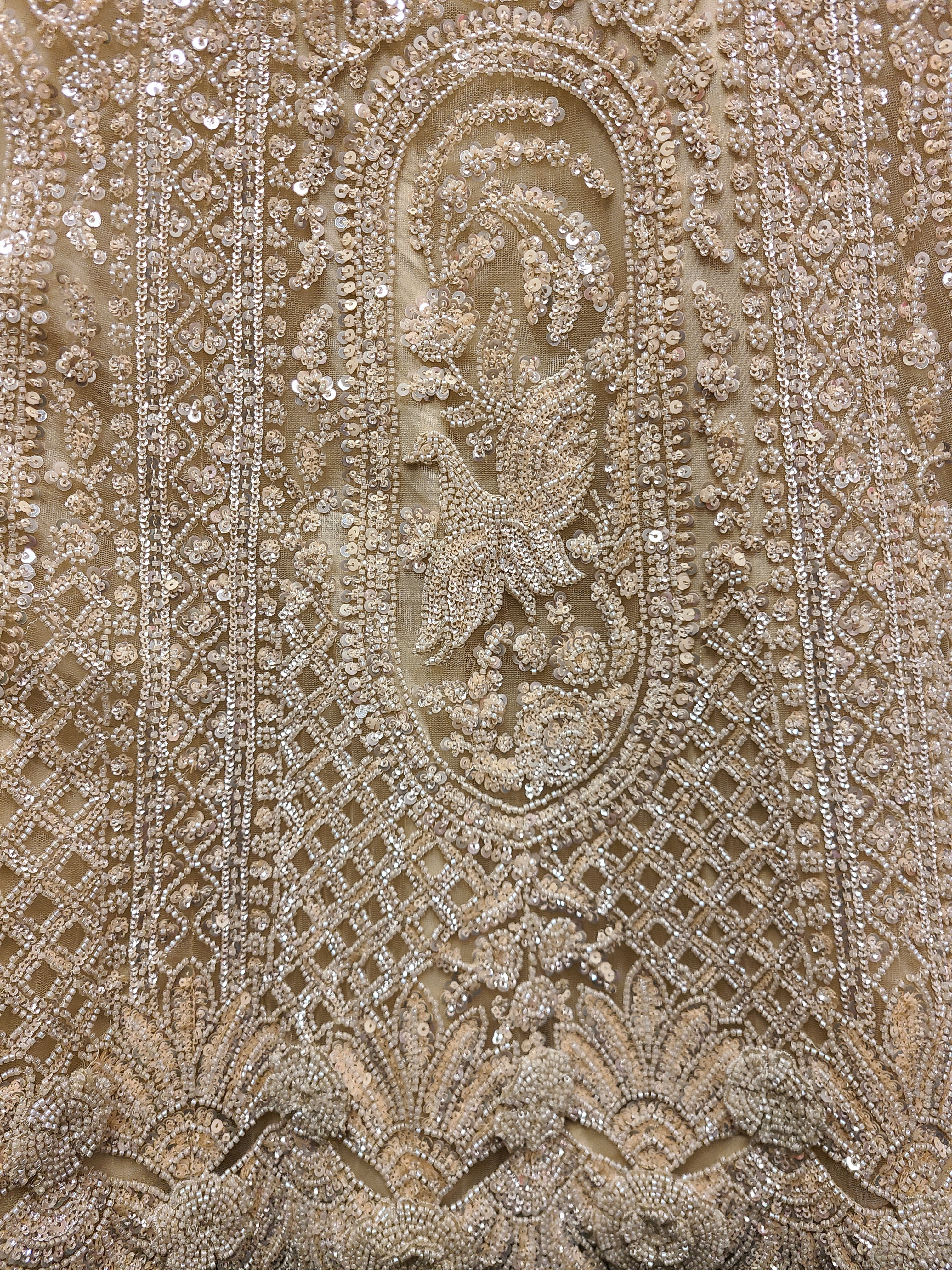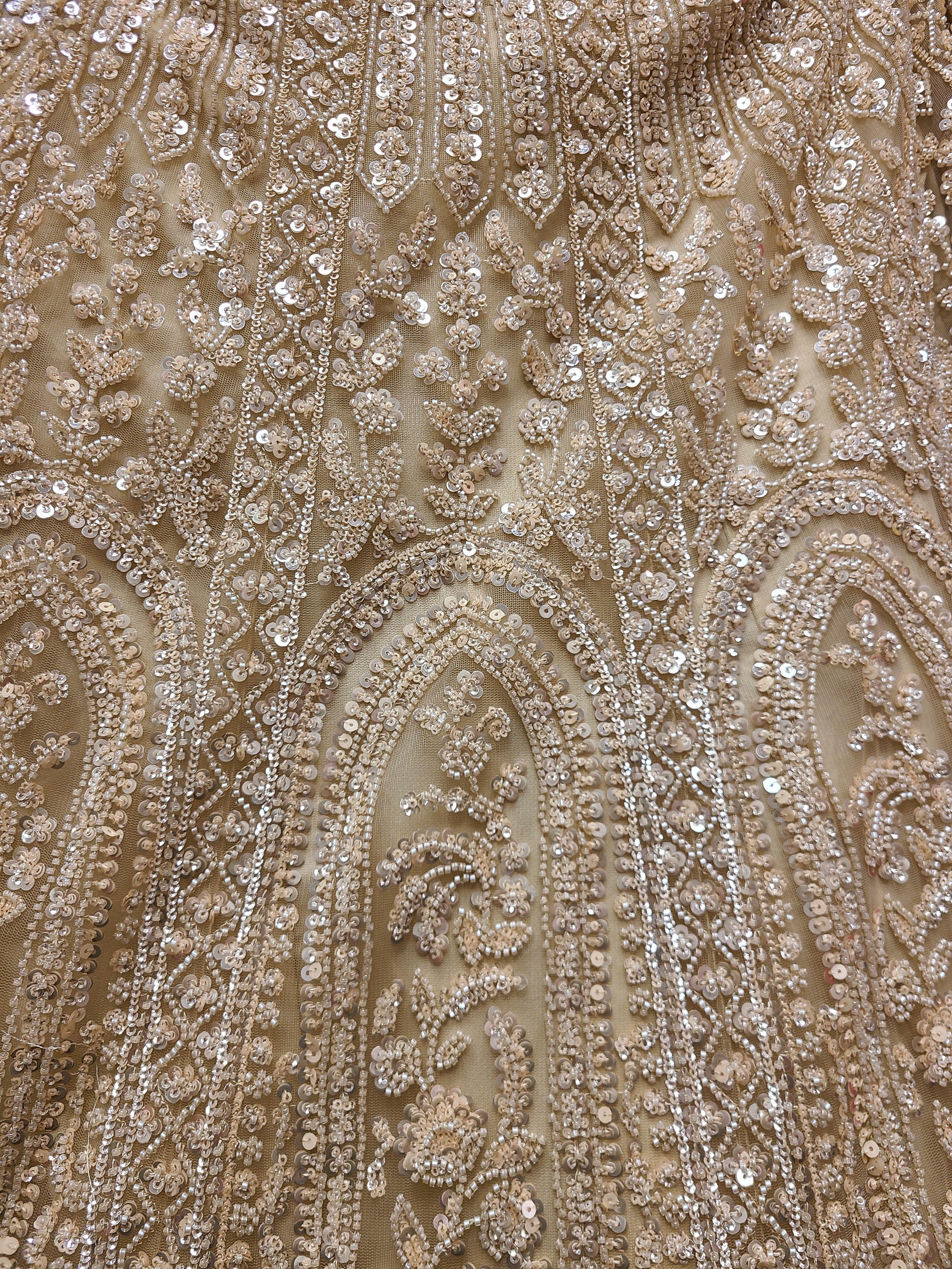 This masterpiece showcases intricate sequin work that creates a stunning all-over shimmer effect. The champagne gold hue exudes timeless elegance and pairs beautifully with both traditional and contemporary jewelry. The sheer dupatta features coordinating embroidered borders that add the perfect finishing touch to this regal ensemble.