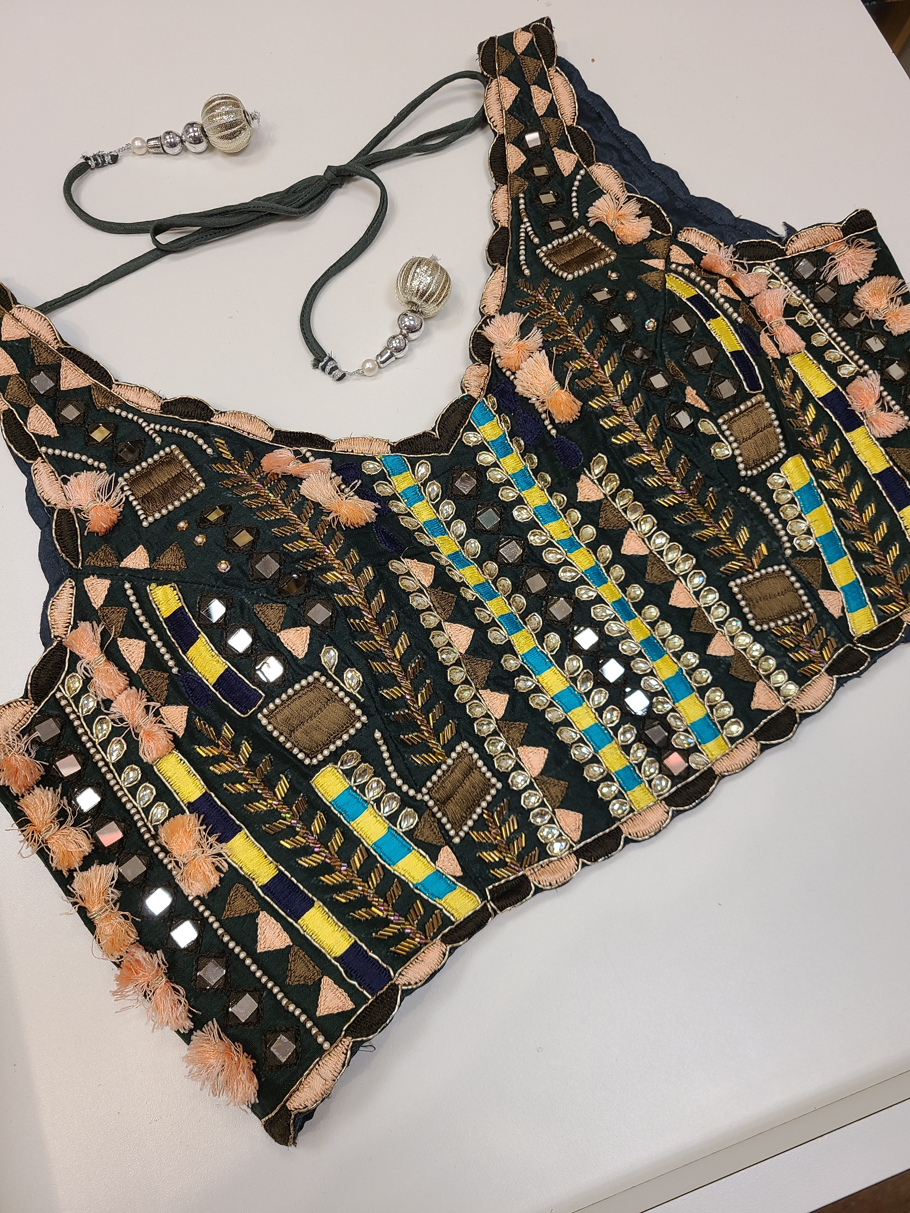 - Opulent Embellishments: Heavily embellished blouse with intricate mirror work, sequins, and beadwork in gold and silver that catches every ray of light