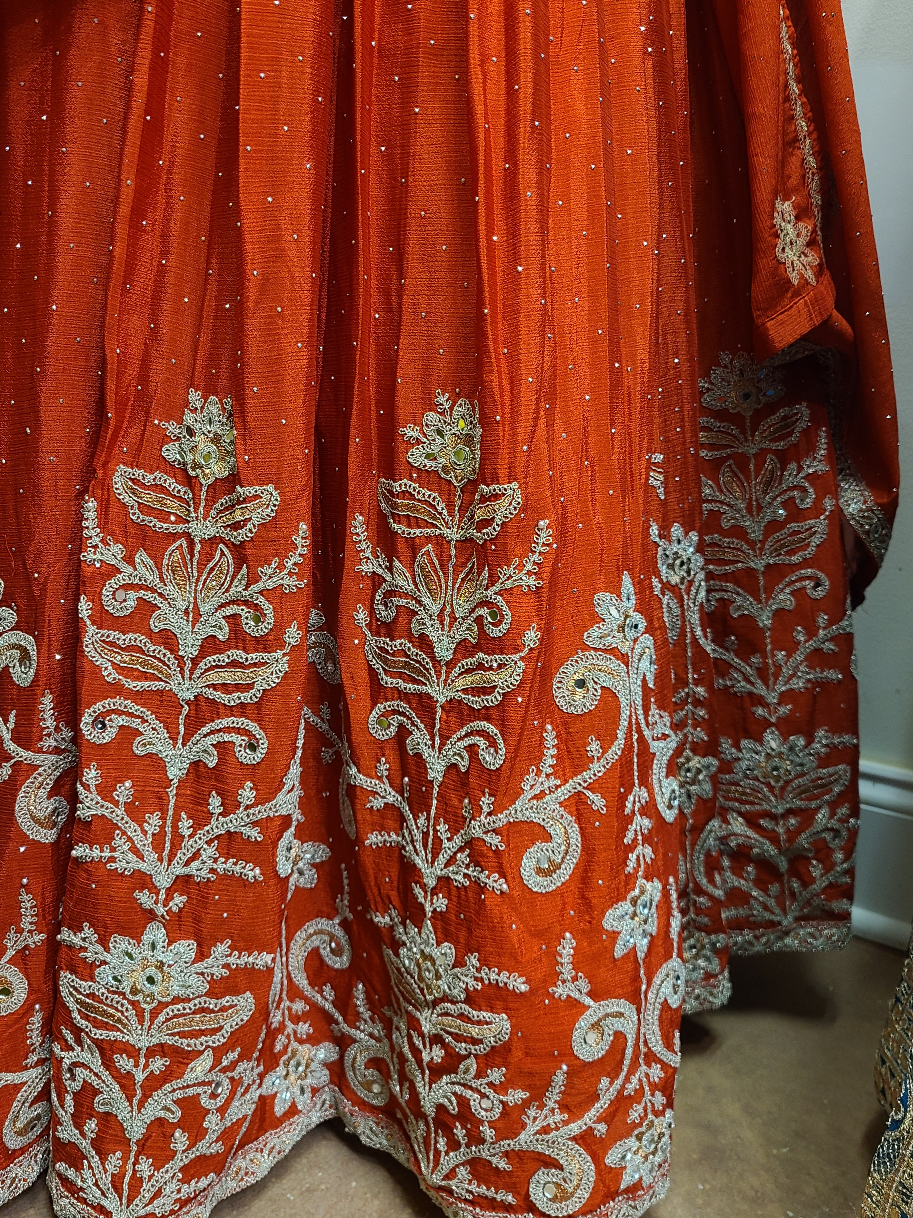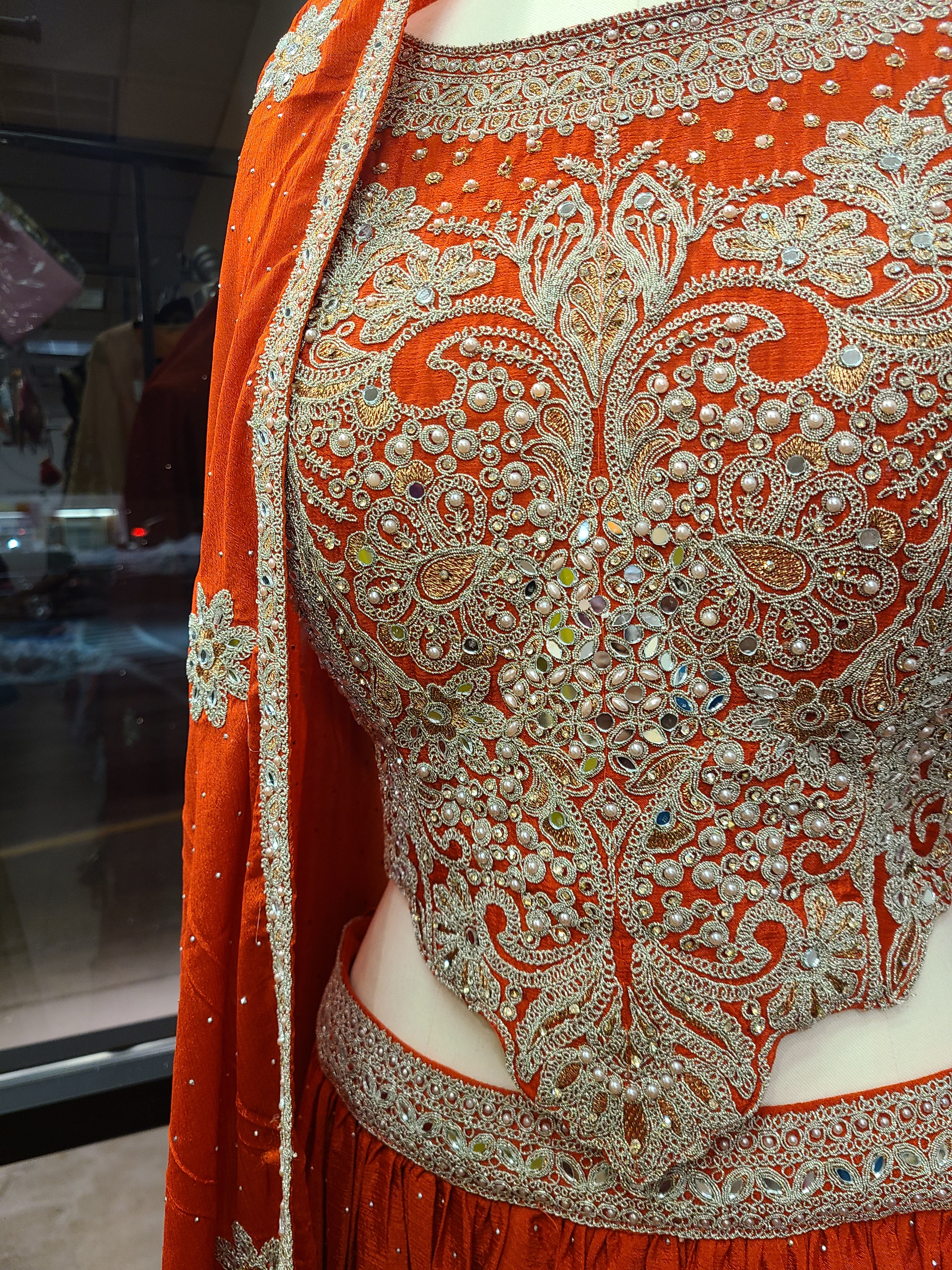 Step into timeless elegance with this exquisite burnt orange lehenga set that captures the essence of traditional Indian craftsmanship. This stunning ensemble is perfect for weddings, festive celebrations, and special occasions where you want to make an unforgettable impression.