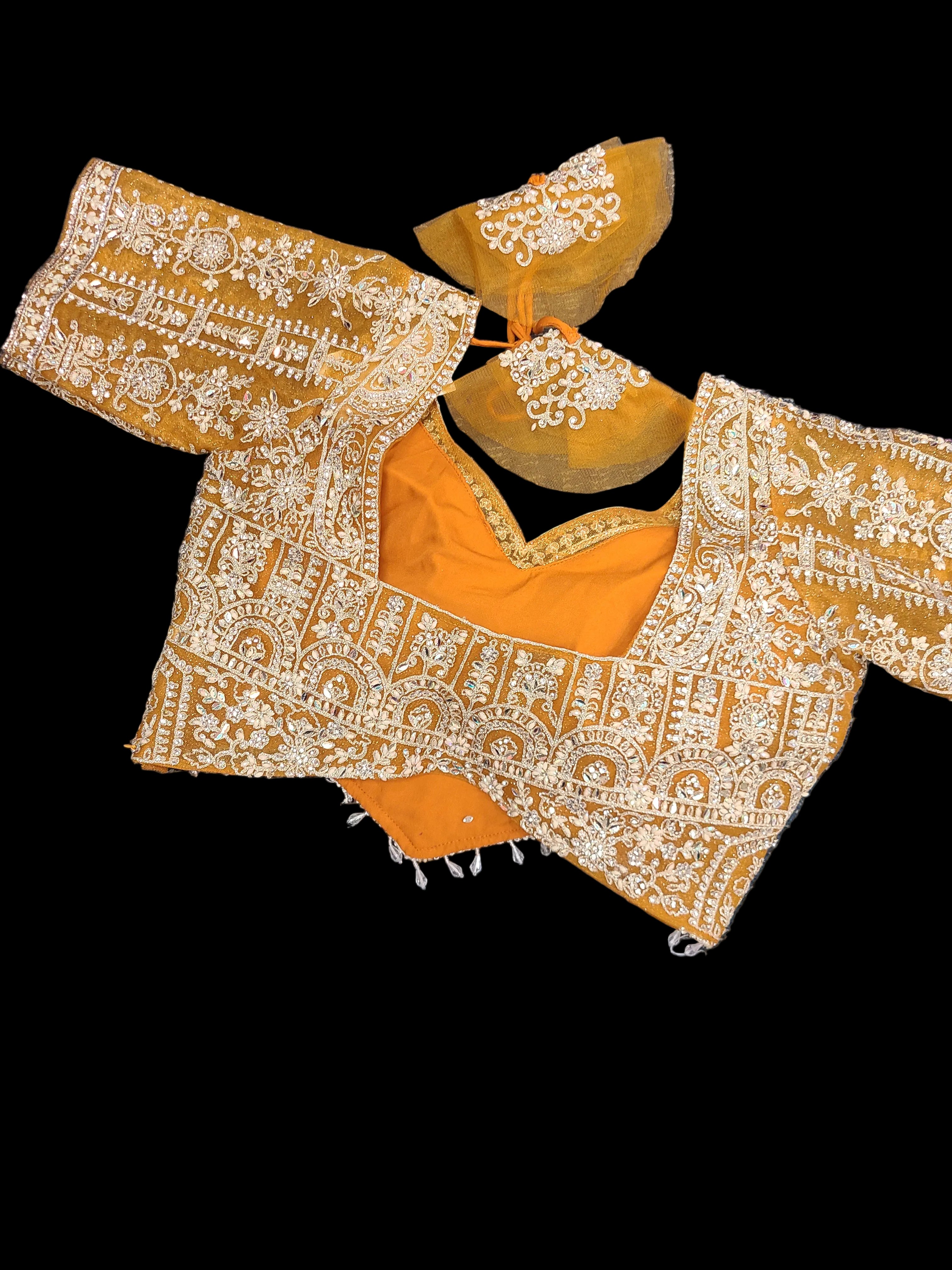 - Heavily embellished golden choli with intricate thread work and beadwork