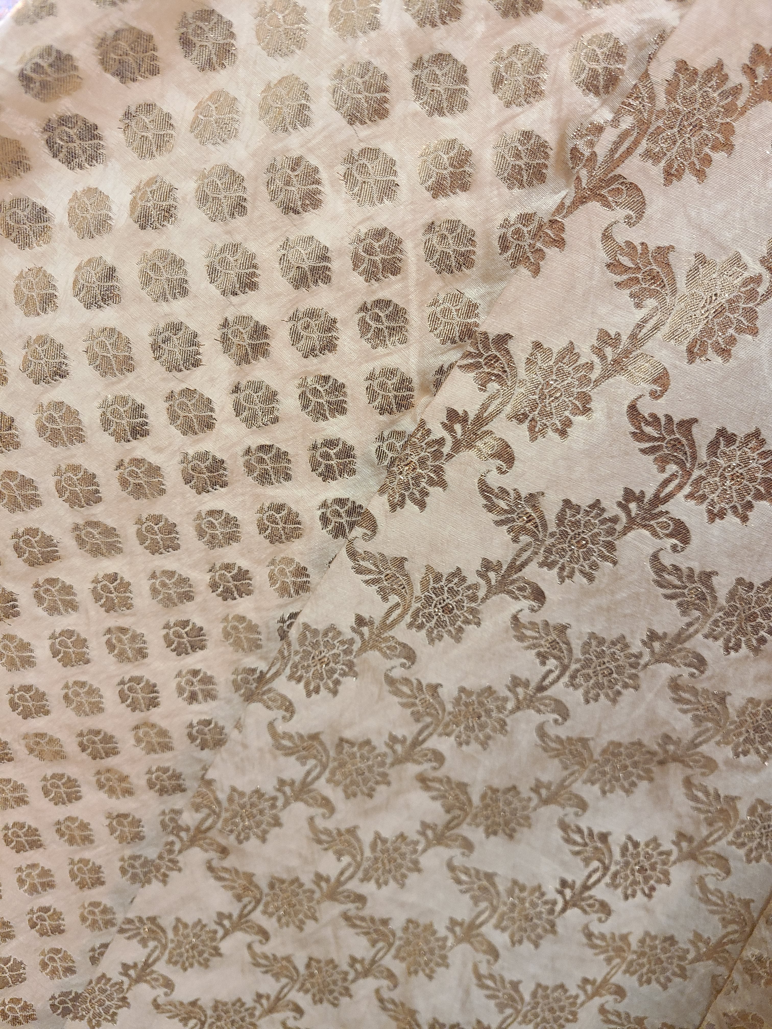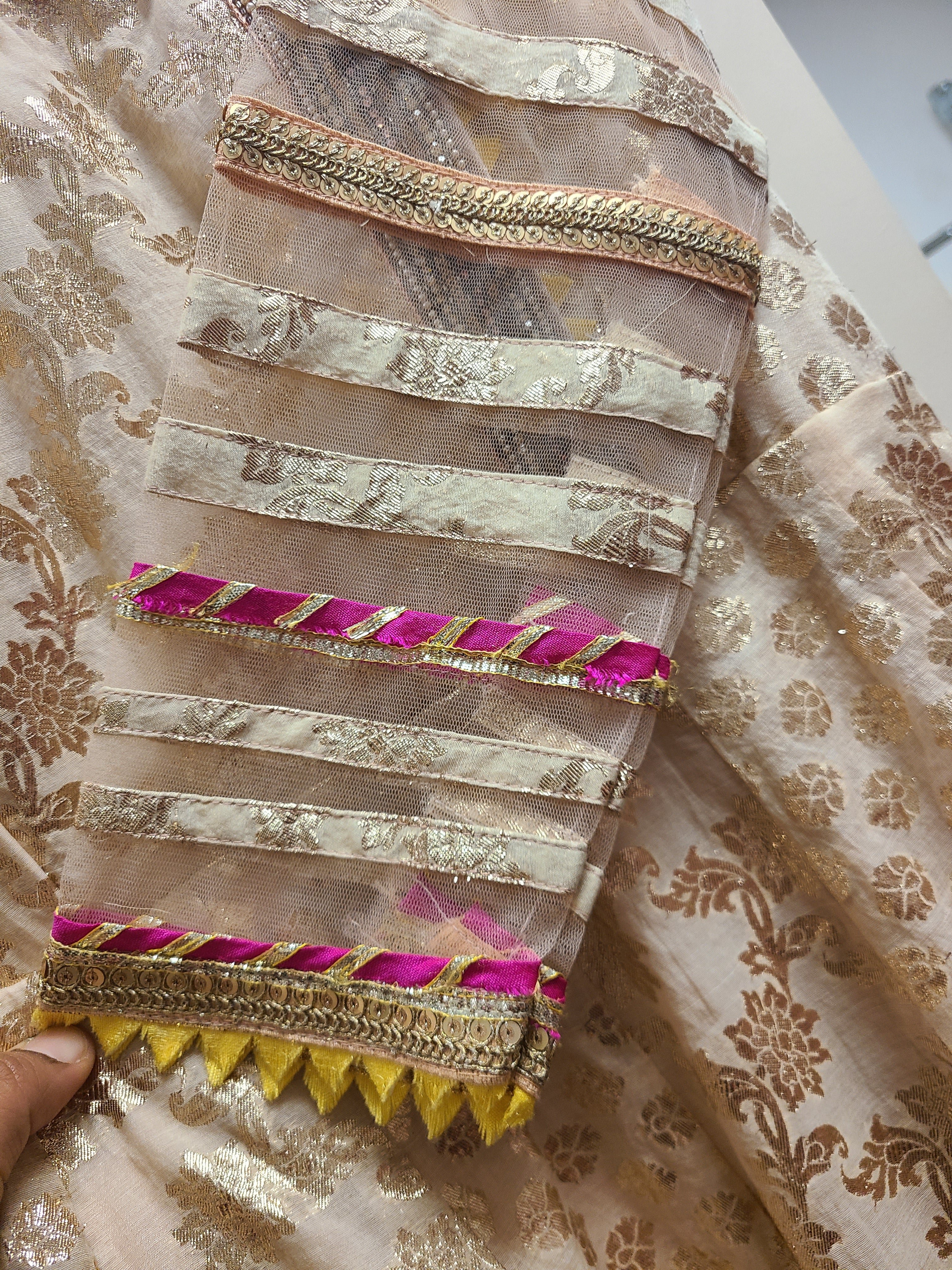 Imagine yourself in a palace courtyard, the cream fabric flowing gracefully as you move, the colorful border peeking out with each step, the intricate embroidery shimmering in the golden light. You're not just wearing a gown - you're embodying timeless elegance, celebrating tradition, and creating unforgettable memories.