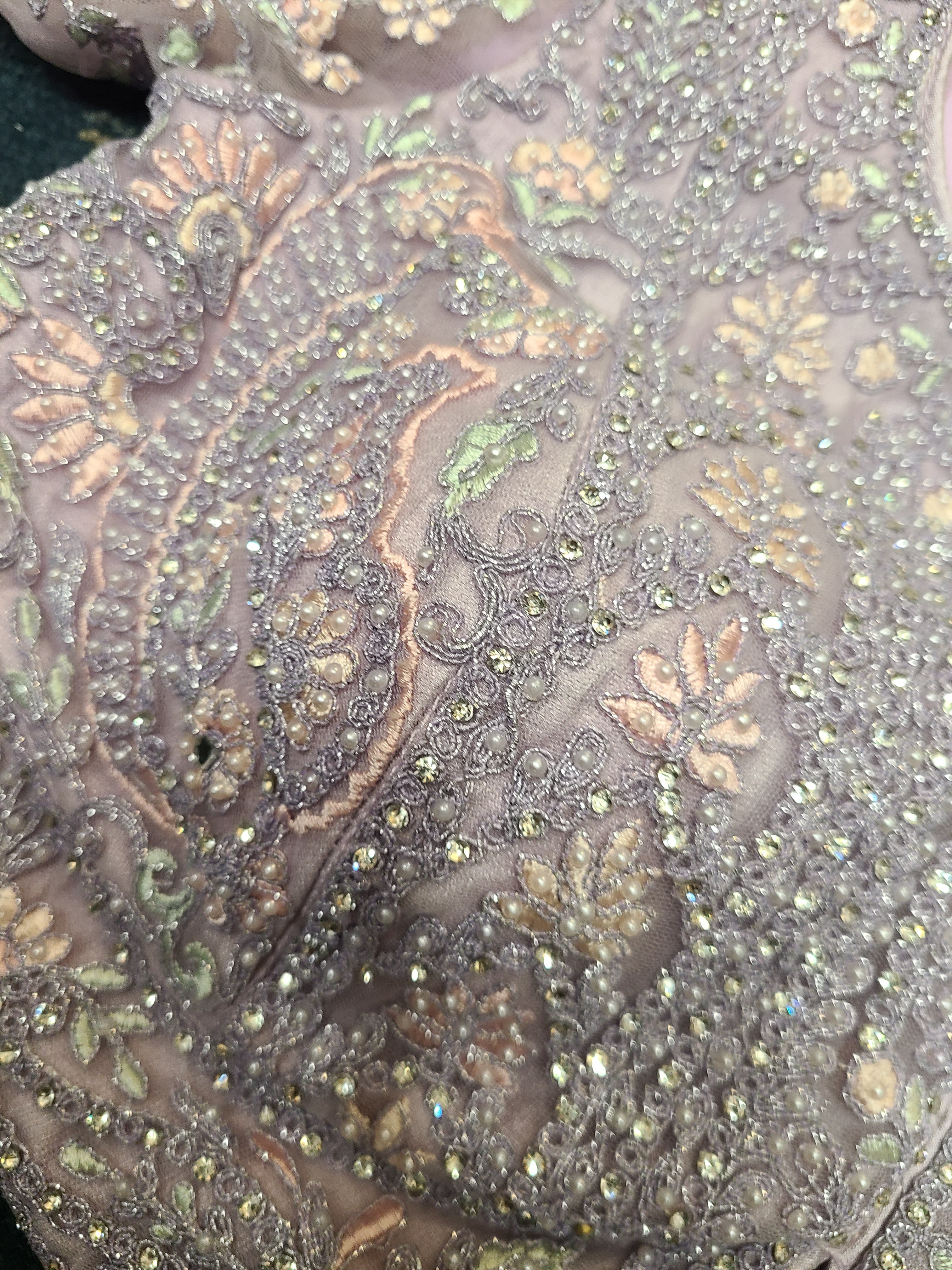 - Sheer Embroidered Dupatta: Lightweight lavender dupatta with silver embroidered borders and scattered motifs