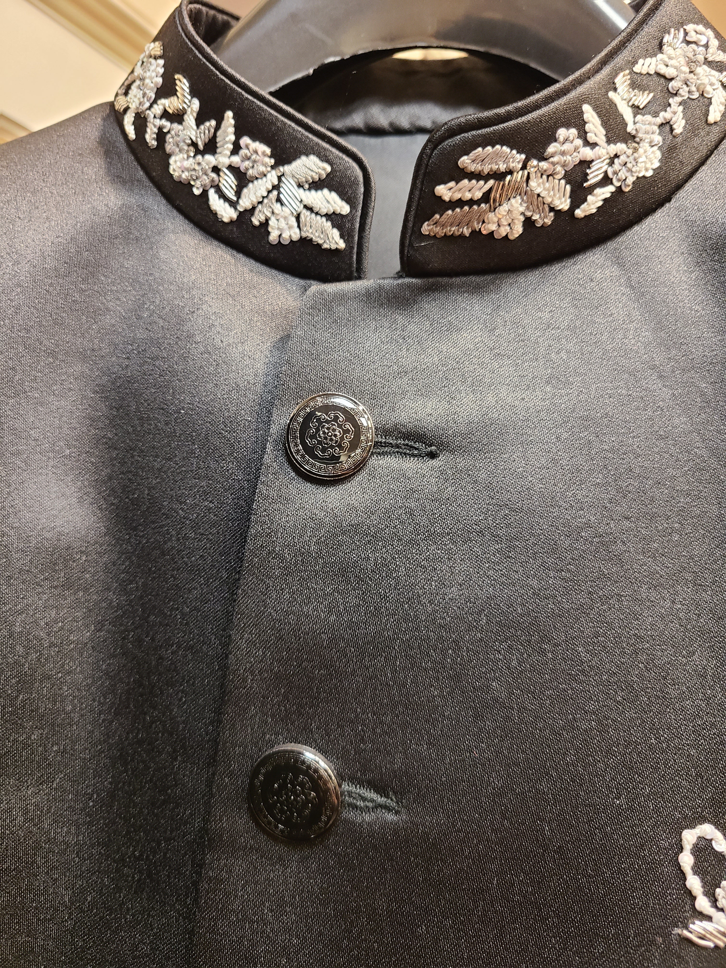 - Intricate Silver Embroidery: Hand-detailed floral motifs on chest and collar that catch light beautifully