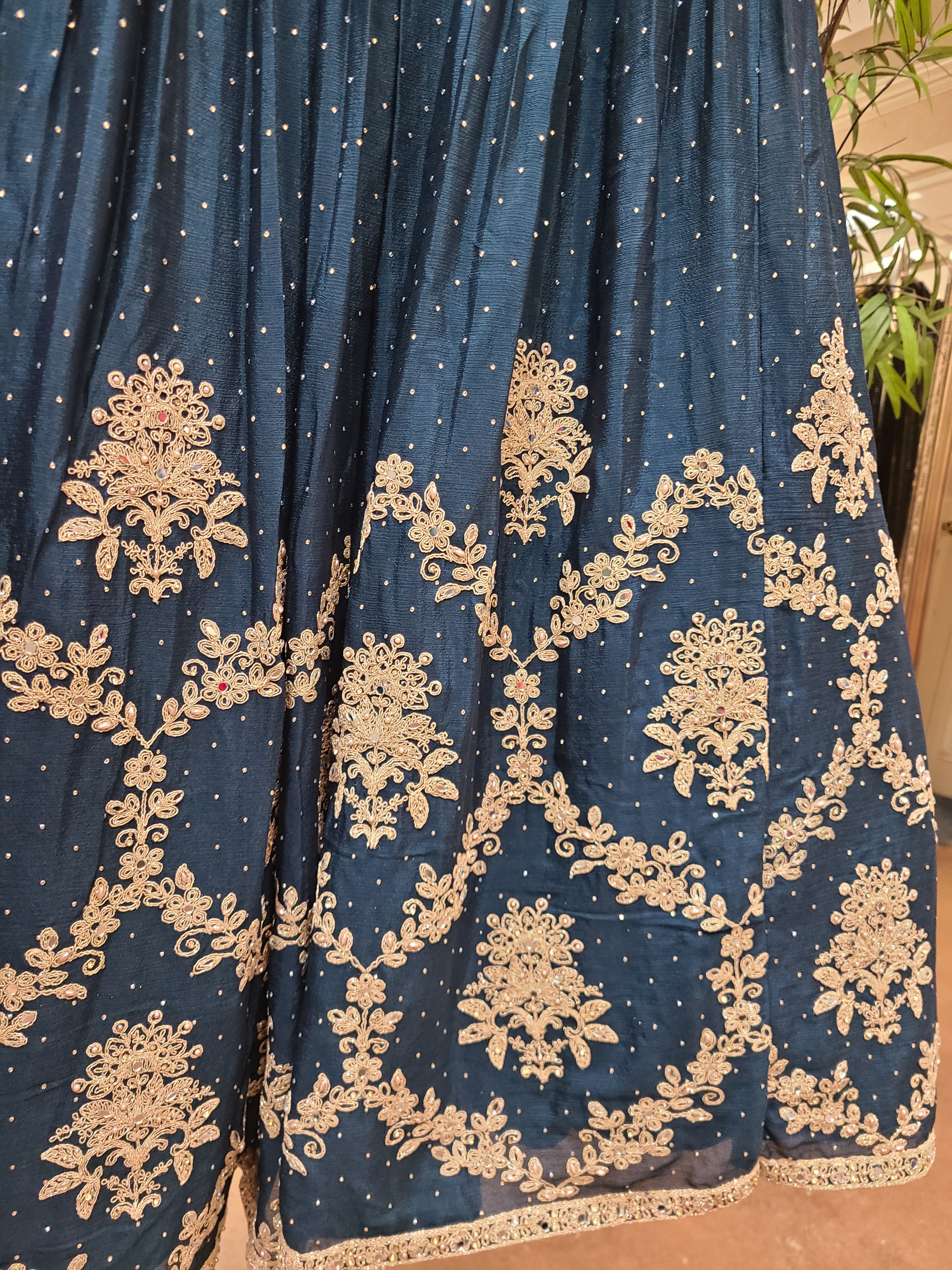 Step into elegance. This navy blue lehenga doesn't just dress you - it transforms you into the epitome of grace and sophistication for your most cherished moments.