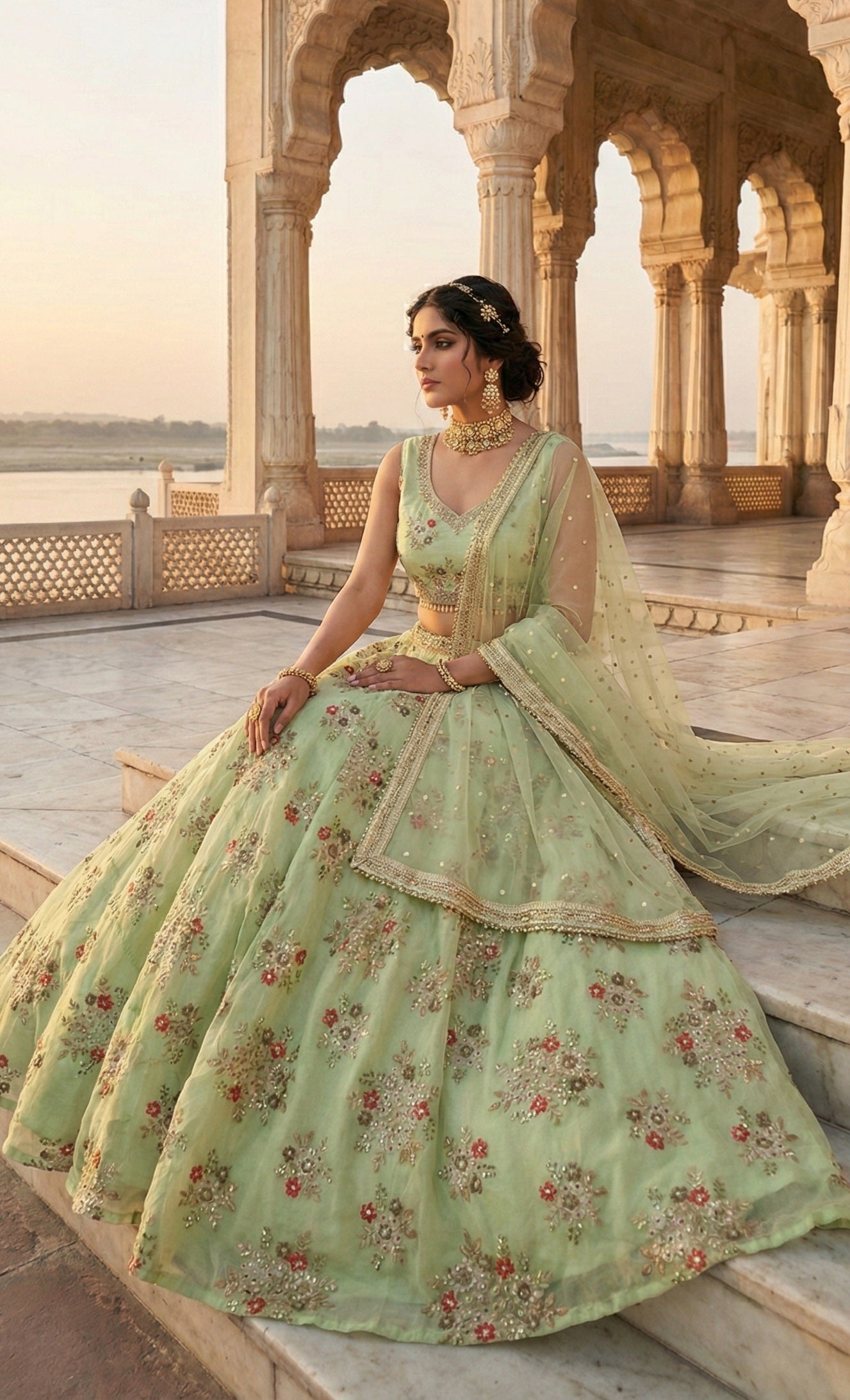Mint Green Floral Embroidered Bridal Lehenga Set