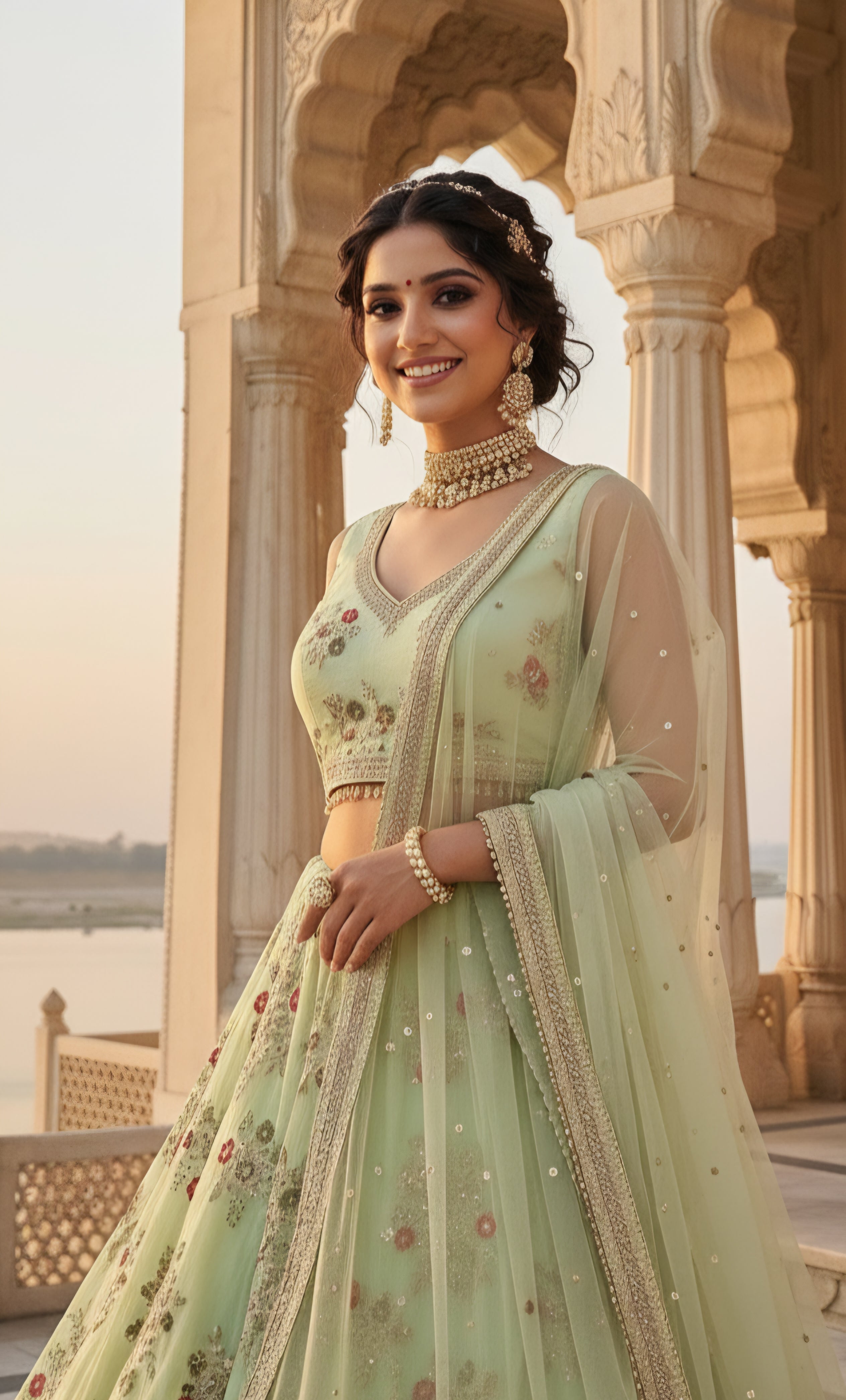 The soft mint green palette pairs beautifully with statement gold jewelry for a traditional bridal look or rose gold for a contemporary twist. Style with a heavy choker necklace, chandelier earrings, maang tikka, and bangles to complete the bridal ensemble. The pastel green shade complements all skin tones and photographs beautifully in natural light, making it perfect for outdoor and daytime celebrations.