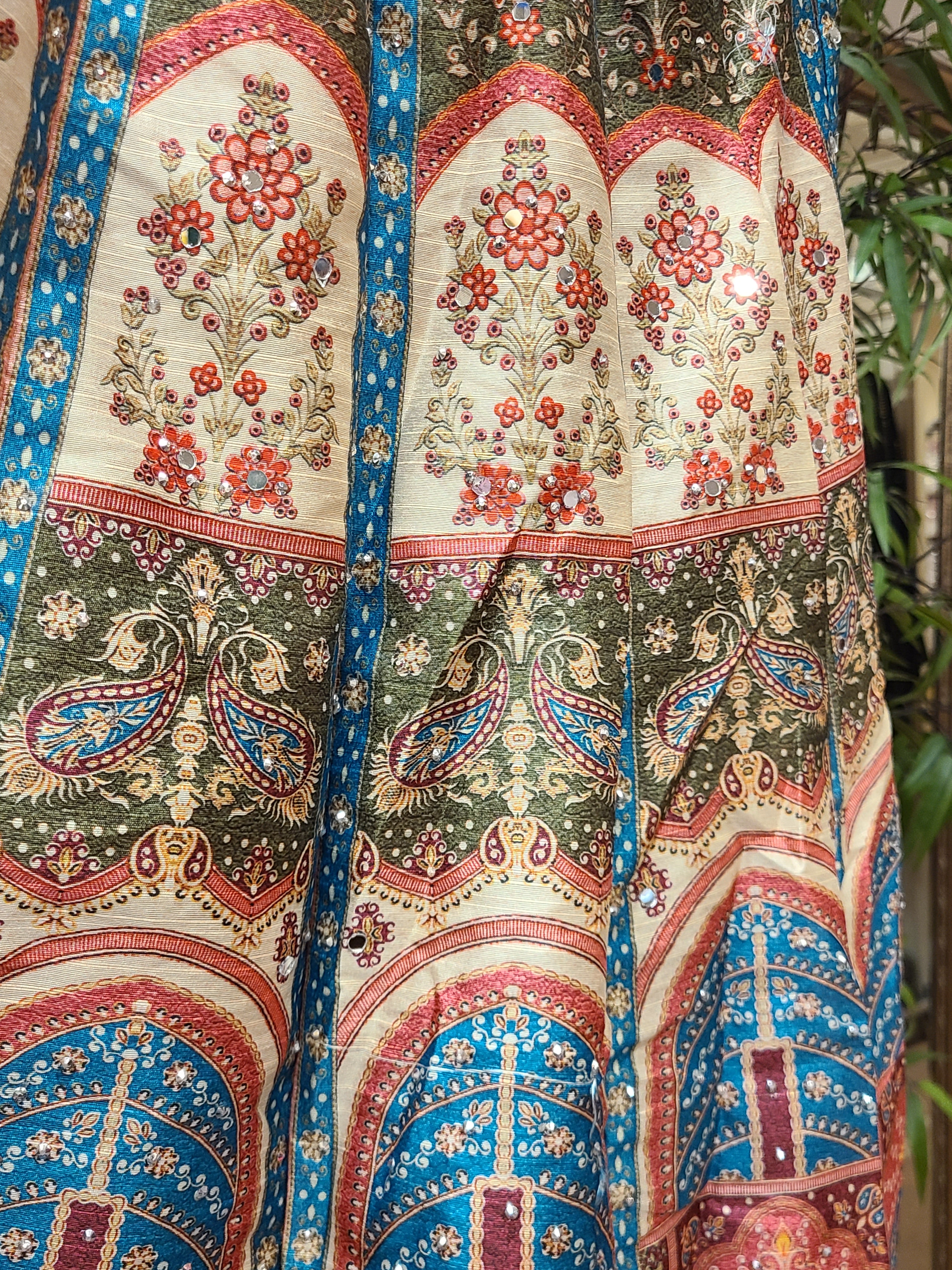 Step into a world of regal beauty with this breathtaking multicolor traditional lehenga choli set that captures the essence of Indian heritage with contemporary flair. This stunning ensemble features an intricate tapestry of rich burgundy, emerald green, and golden hues that dance together in perfect harmony.