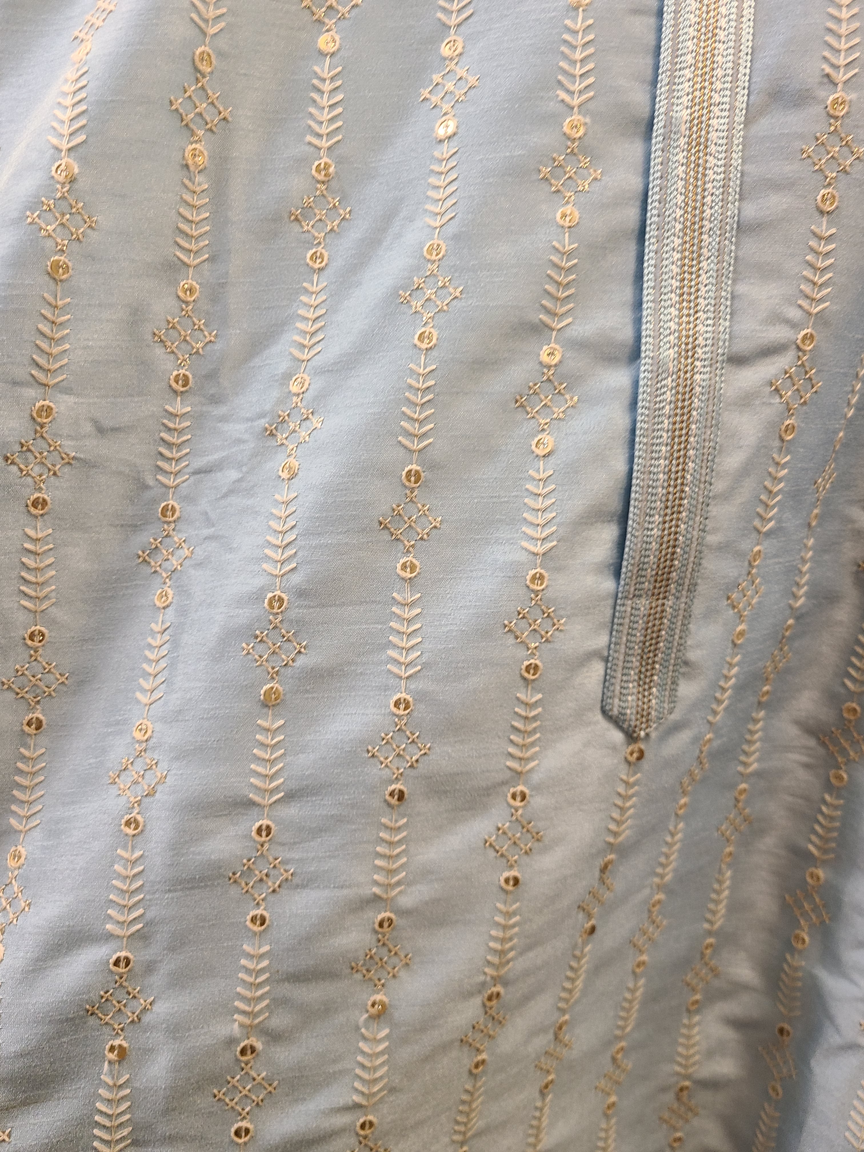 The serene light blue color represents peace and wisdom, making it an excellent choice for auspicious occasions. The subtle embroidery adds just the right amount of detail without being overwhelming, perfect for the discerning gentleman.