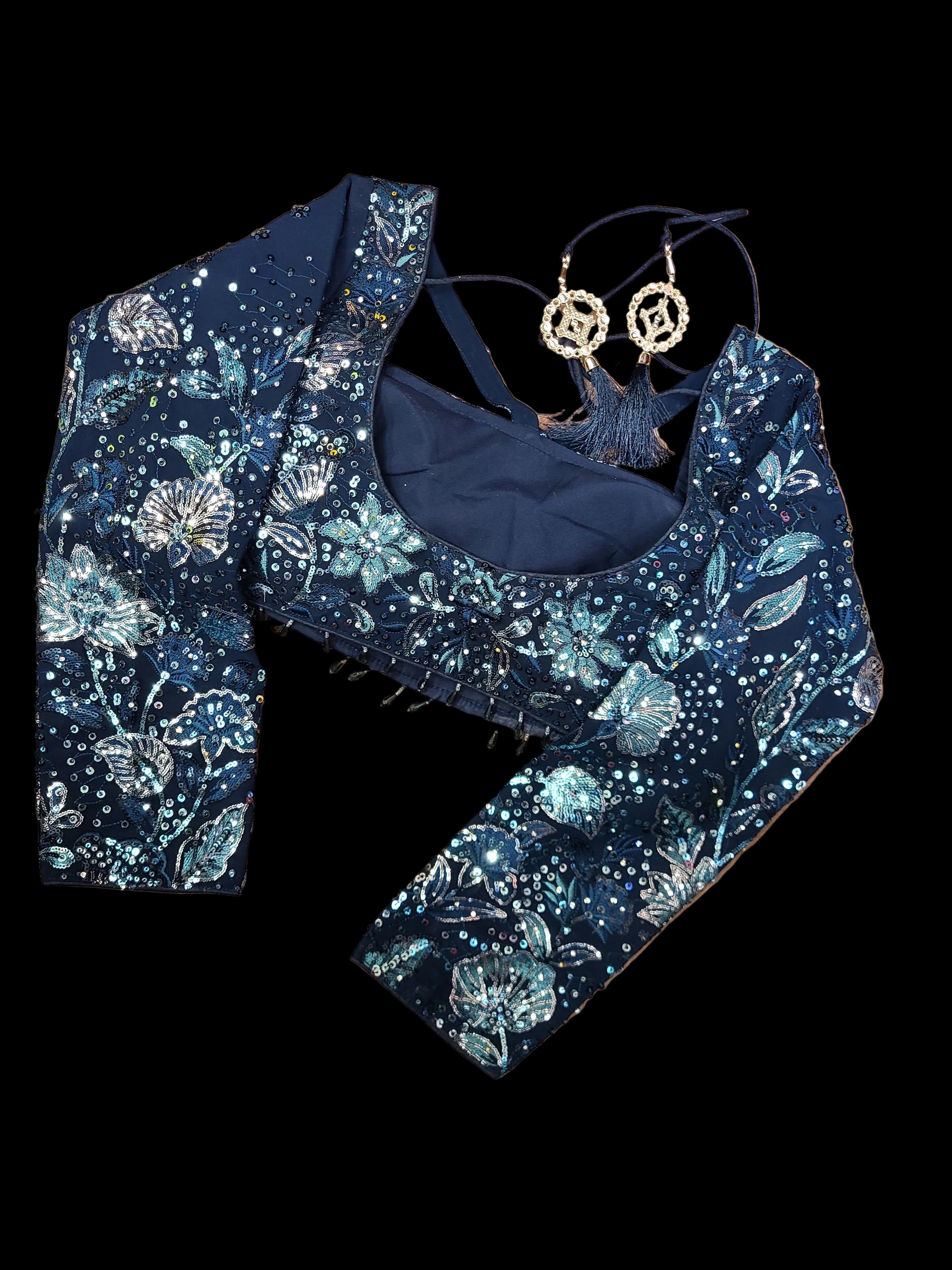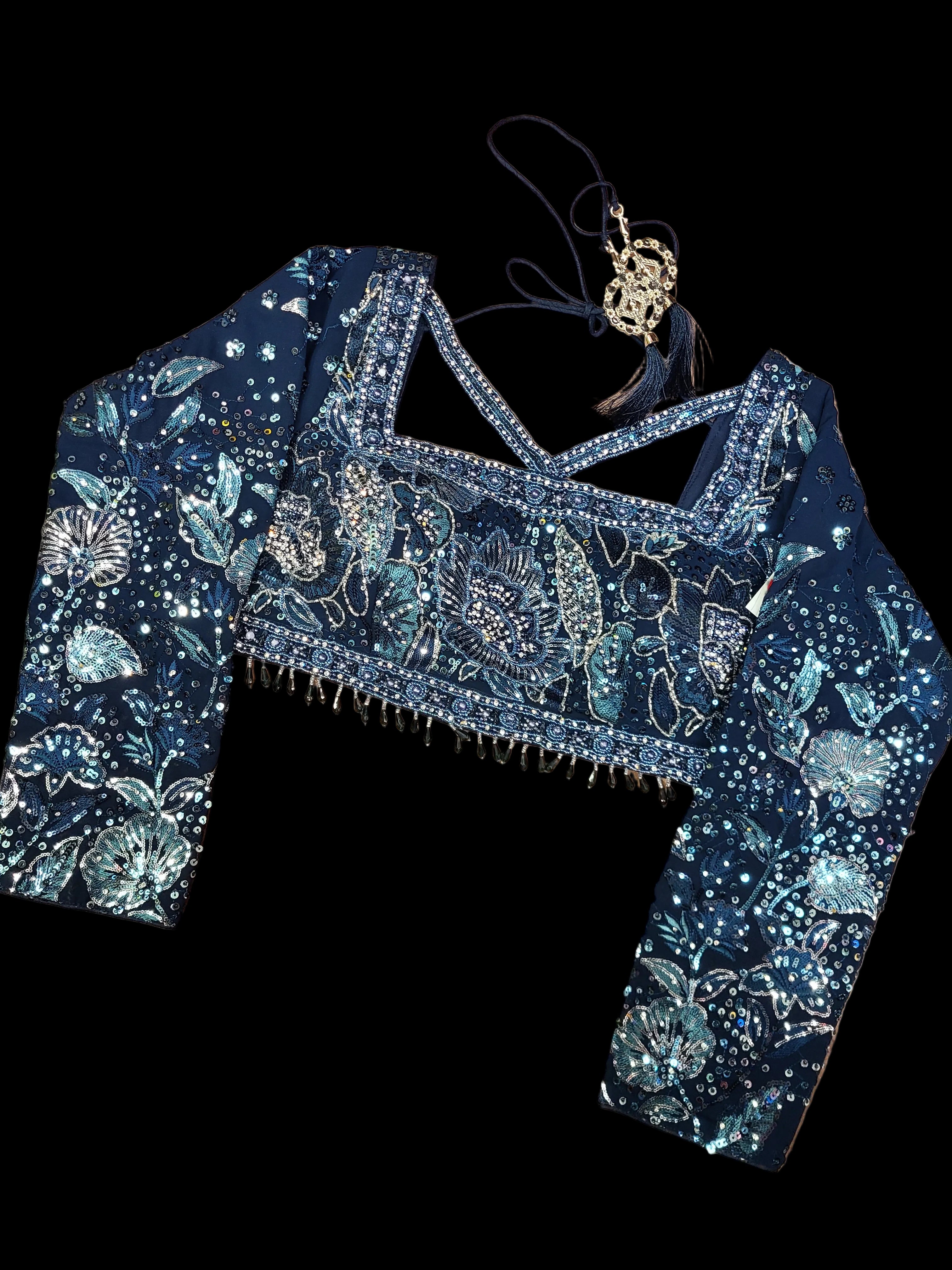 The classic navy blue shade makes this lehenga incredibly versatile. It's perfect for all seasons, complements various skin tones, and can be styled in multiple ways. Wear it with heavy jewelry for a traditional look, or keep accessories minimal for a more contemporary, elegant appearance. The long sleeves make it suitable for cooler weather and formal settings.