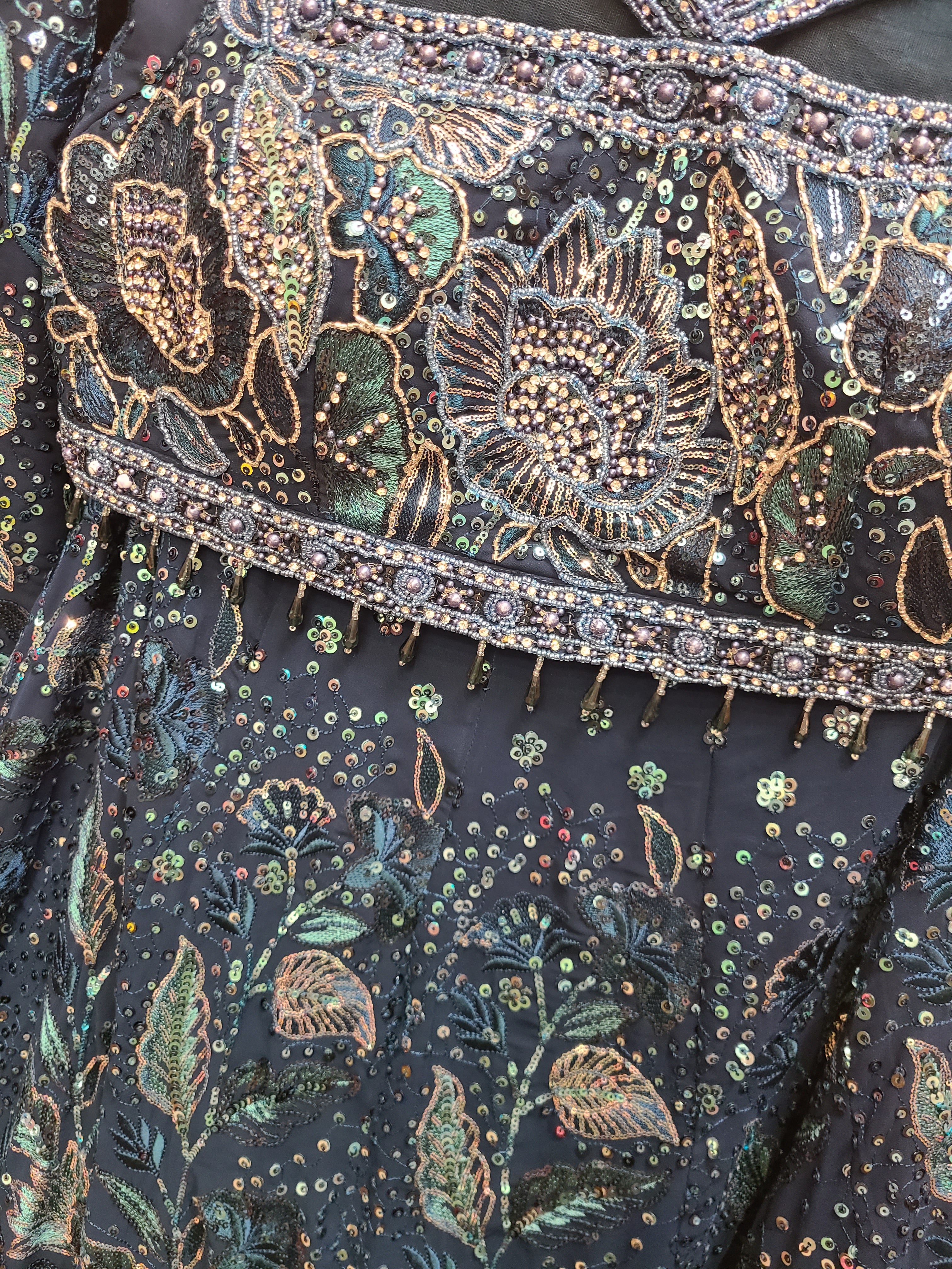 This navy blue lehenga is the epitome of understated elegance. The deep navy color is universally flattering, photographs beautifully in all lighting conditions, and creates a sophisticated alternative to traditional reds and pinks. The silver embroidery creates a stunning contrast against the navy base, adding richness and visual interest. The multi-tiered design with varying embroidery patterns adds depth and dimension, while the long sleeves provide elegant coverage perfect for formal occasions.