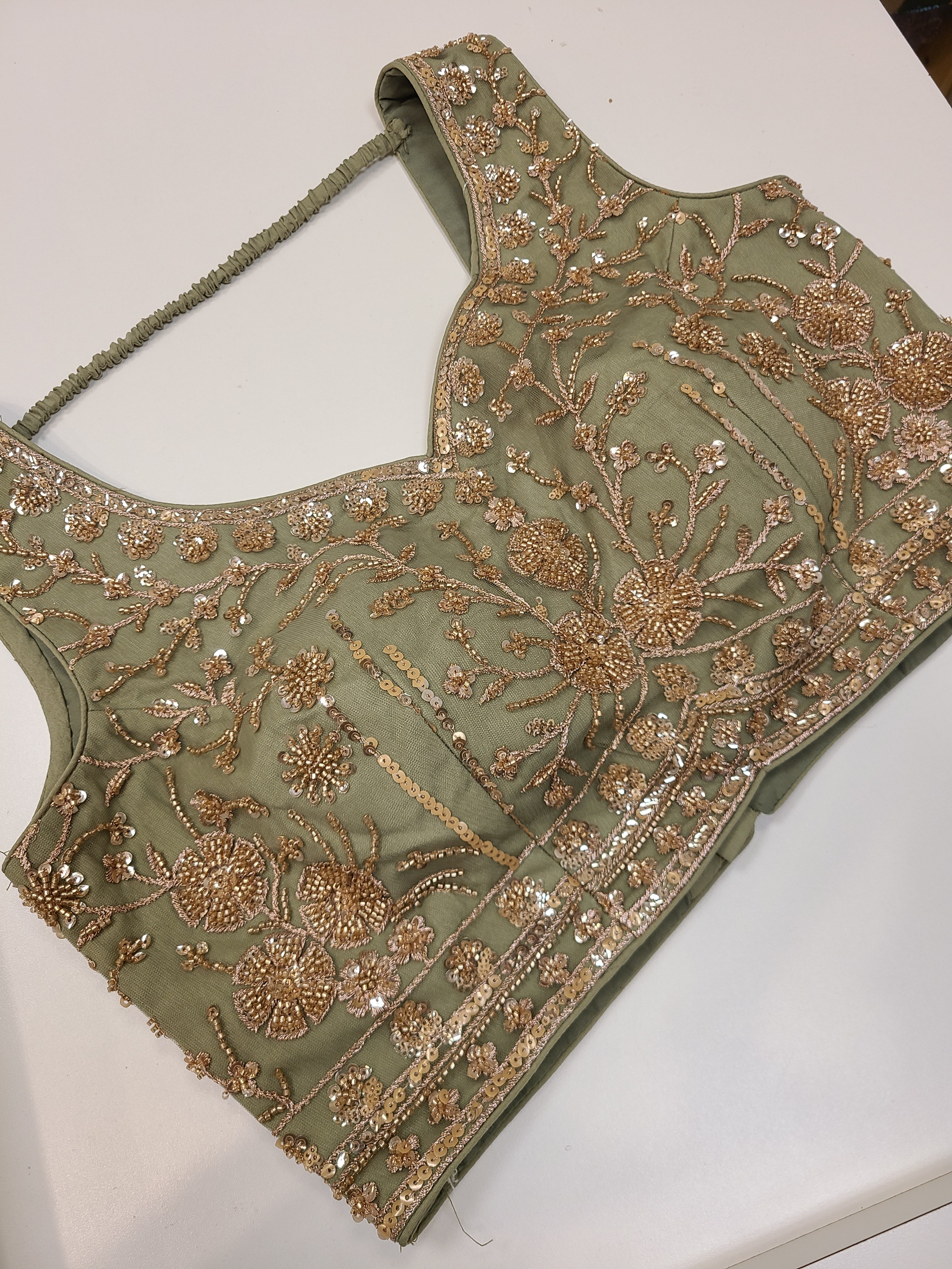 Pair with traditional gold jewelry, a statement choker necklace, and elegant bangles to complete your bridal look. The sophisticated olive hue complements all skin tones and photographs beautifully in both natural and indoor lighting.