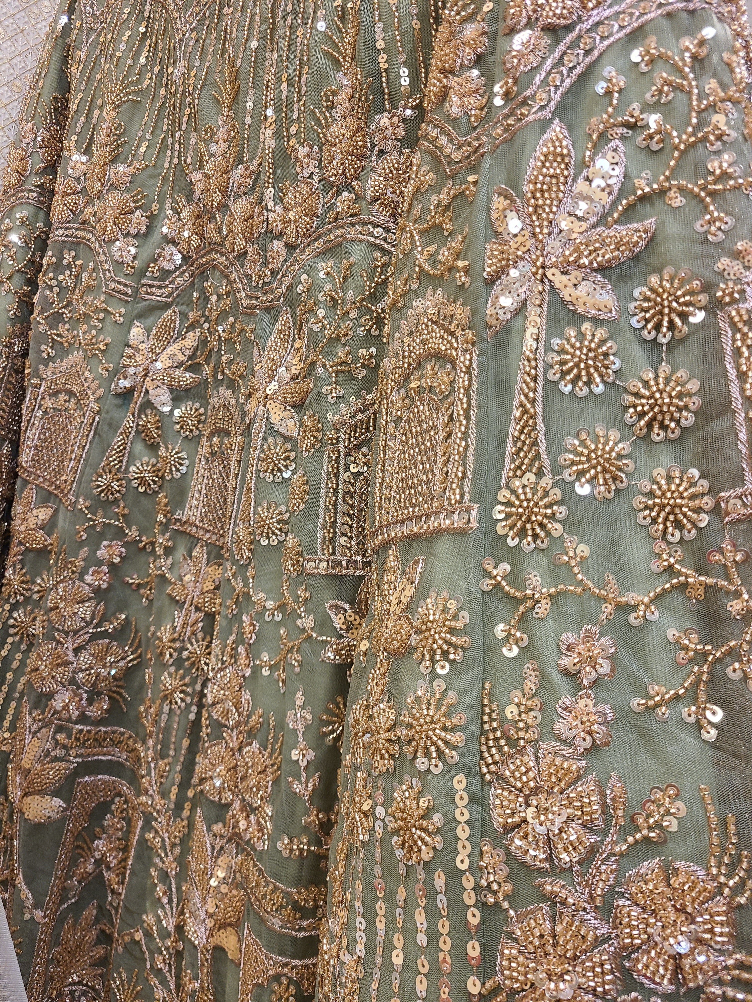 Inspired by the grandeur of royal Indian palaces, this olive green masterpiece captures the essence of heritage with a modern twist. The rich earthy tone symbolizes growth and harmony, while the intricate gold embroidery represents prosperity and celebration. Every stitch tells a story of skilled artisanship passed down through generations.