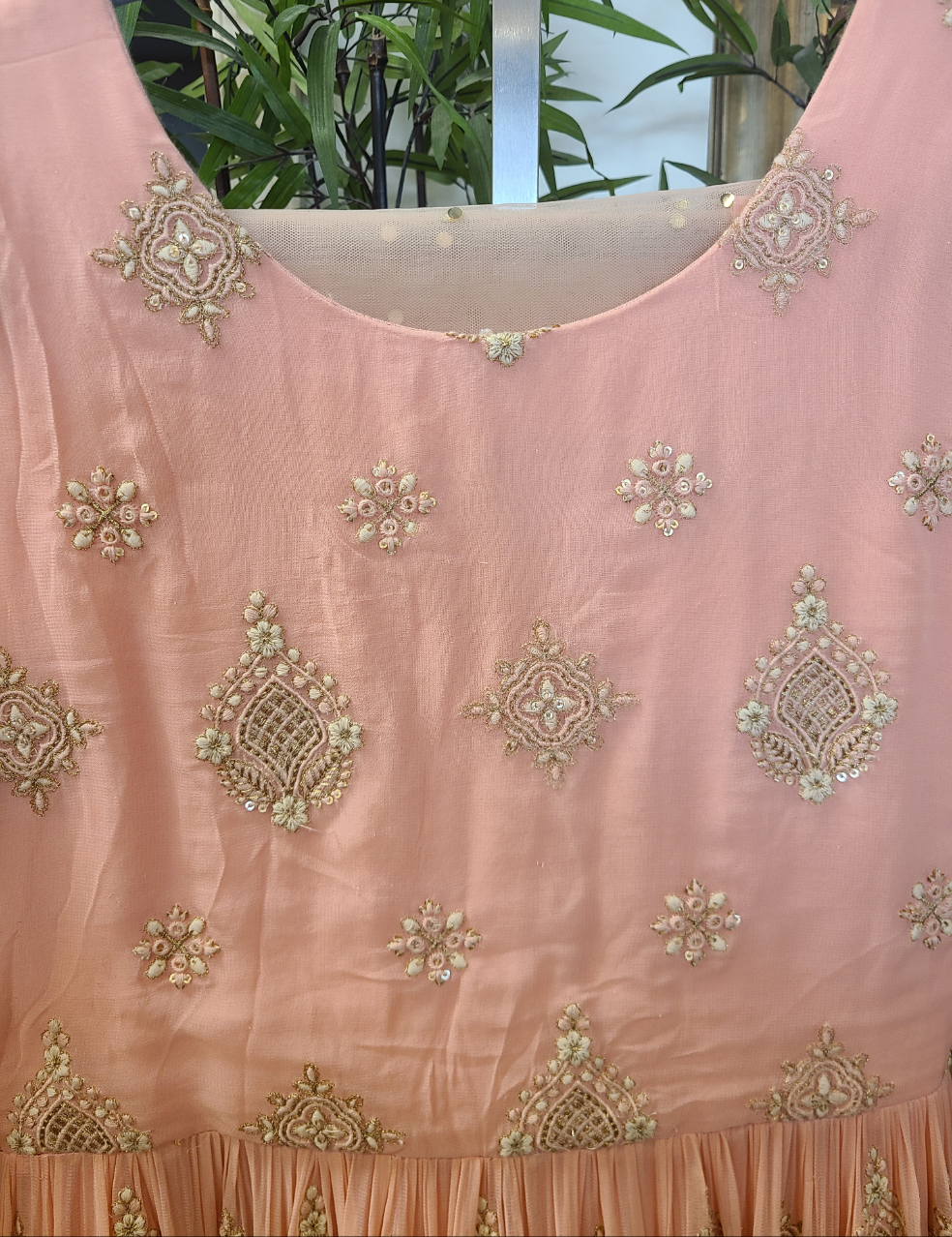 Embrace your inner princess with this stunning peach anarkali gown. Perfect for creating unforgettable memories on your most special day while feeling like the royalty you are. This is more than just an outfit – it's a celebration of timeless elegance and traditional craftsmanship.