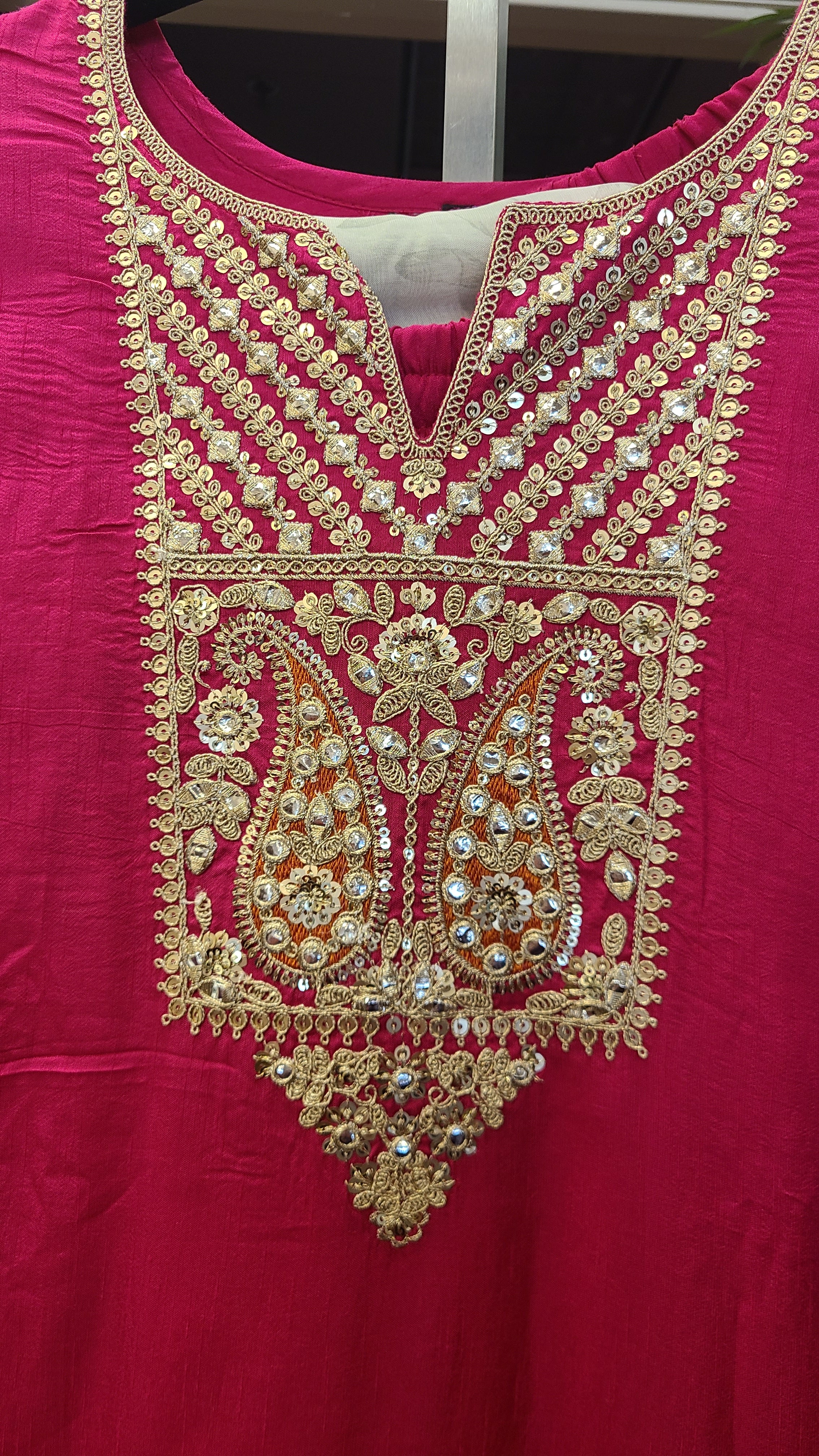 Step into the spotlight with this breathtaking Pink Embroidered Kaftan and Palazzo Set that perfectly captures the essence of contemporary Indian fashion. This stunning Indo-Western ensemble combines traditional craftsmanship with modern silhouettes, making it an absolute must-have for your festive wardrobe.