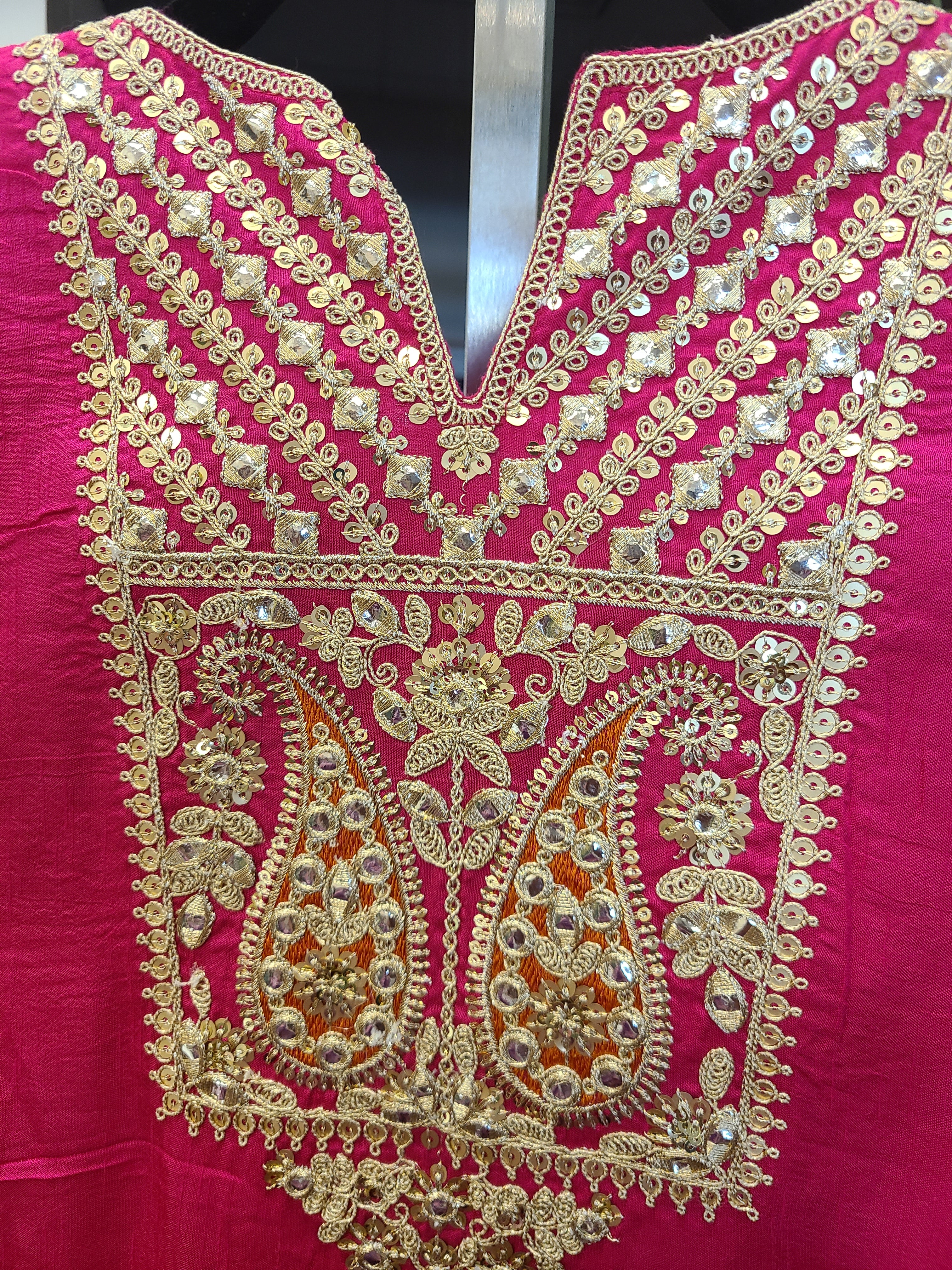 Complete the look with statement chandelier earrings and delicate bangles as shown. Pair with embellished heels or traditional mojaris. The vibrant pink tones beautifully complement gold and kundan jewelry. Style your hair in soft waves for an effortlessly elegant appearance.