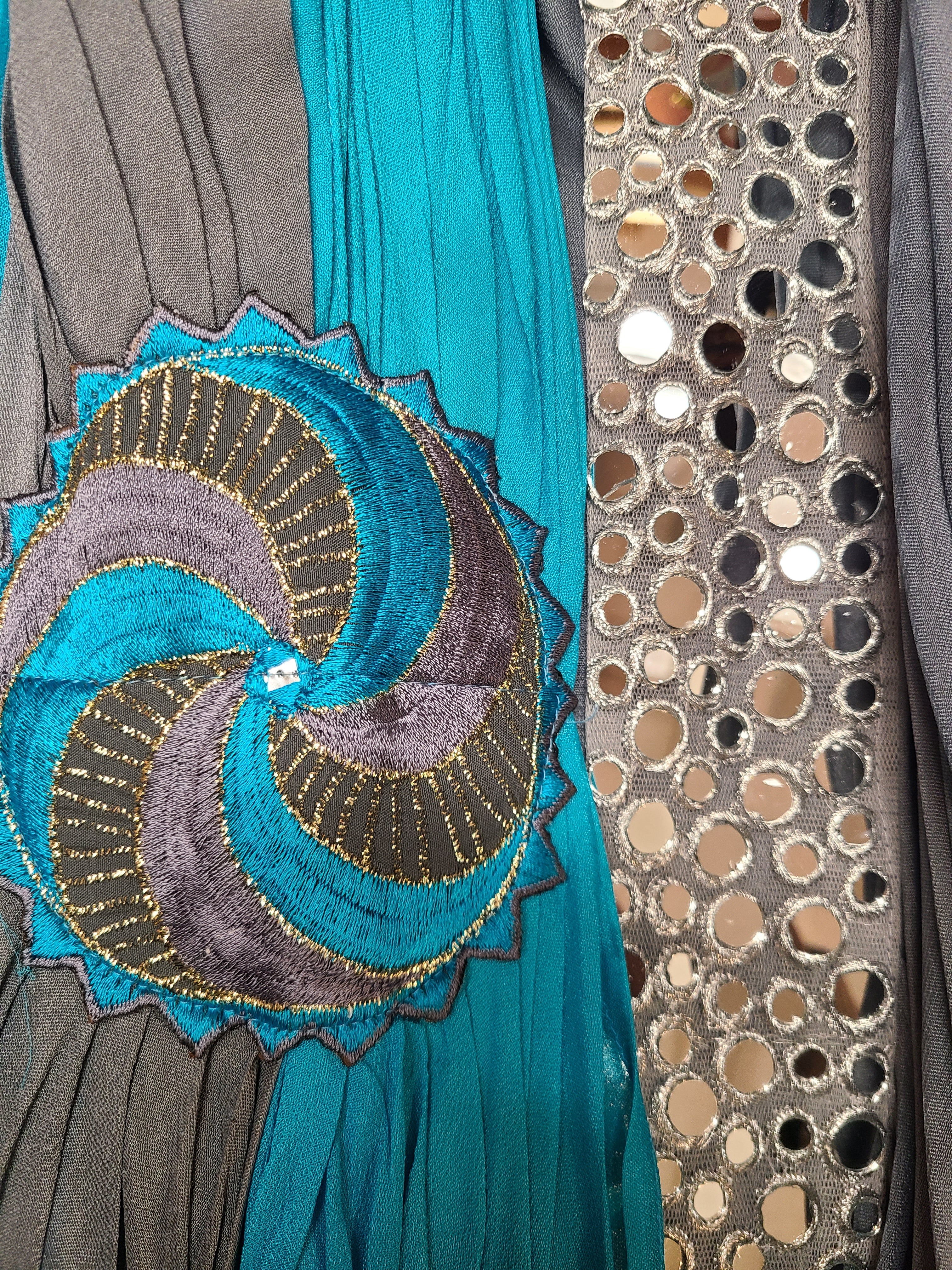 This is not your traditional ethnic wear – it's a bold fusion of contemporary design and Indian aesthetics. The unique color combination of grey and teal is fresh, modern, and incredibly photogenic. The asymmetric layering and sequin detailing create a high-fashion look that's perfect for the woman who wants to make a memorable impression.