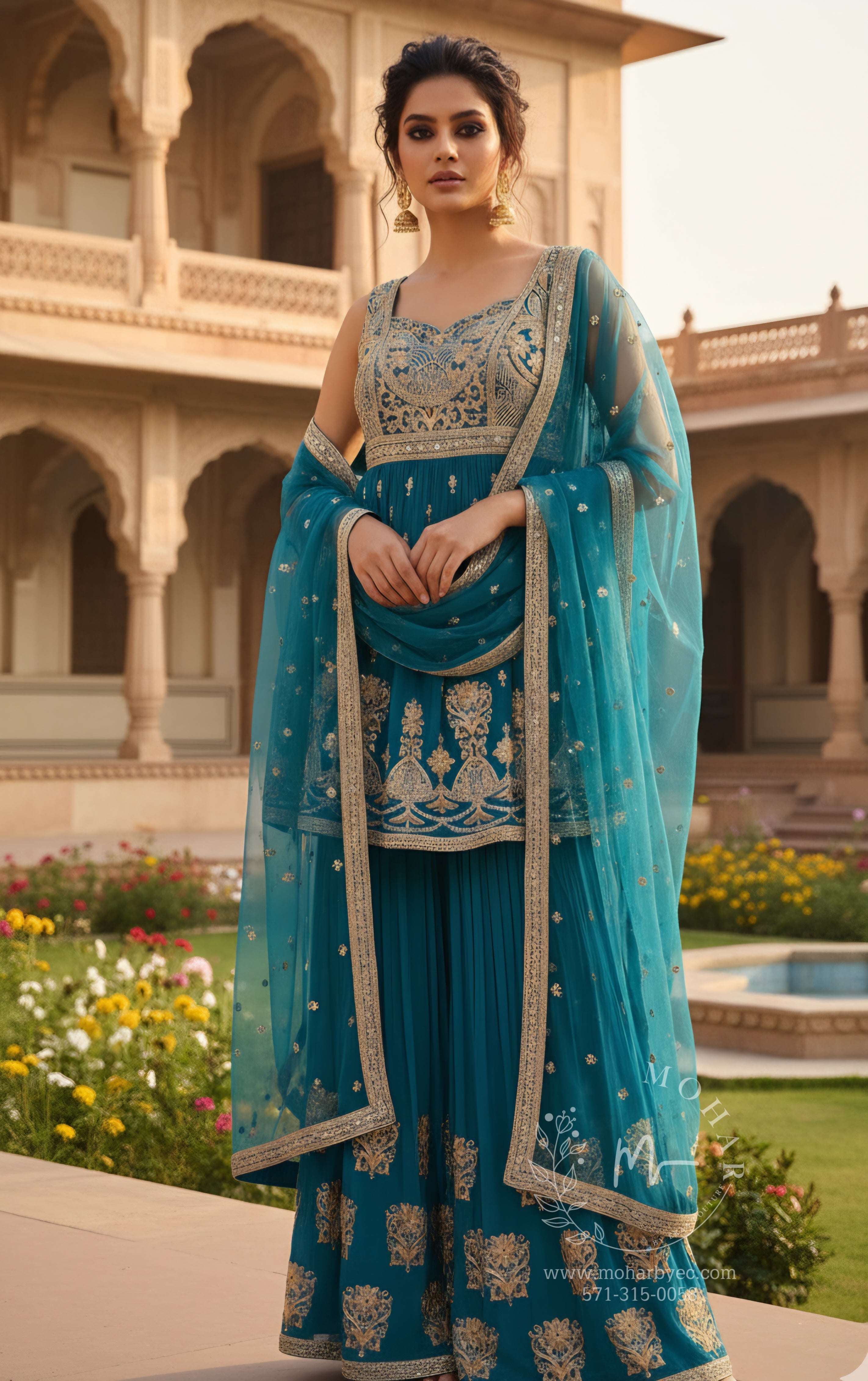 Pair with statement gold or silver jewelry for a regal look. The vibrant turquoise blue photographs beautifully in palace and heritage settings and flatters all skin tones. The flowing sharara creates stunning movement—perfect for architectural backdrop photography.