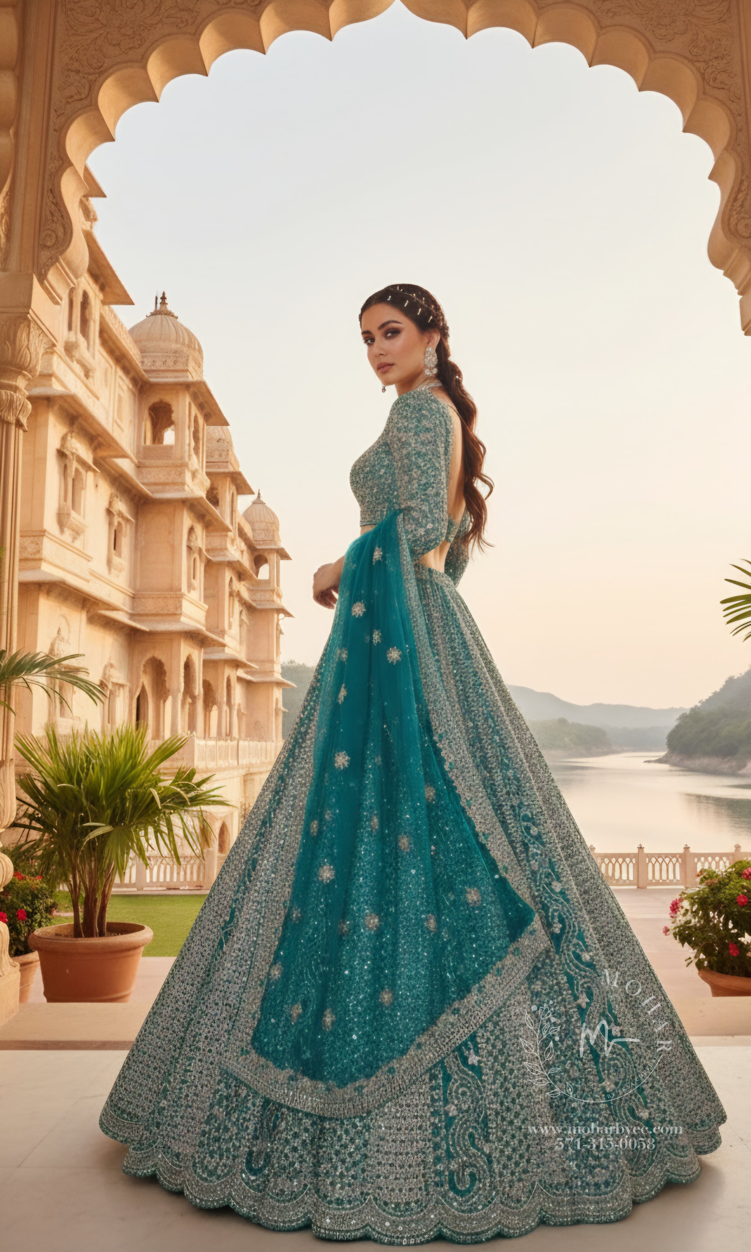 Captivate hearts with this stunning turquoise lehenga that combines contemporary color with traditional elegance. Perfect for making an unforgettable, dazzling statement at any celebration!
