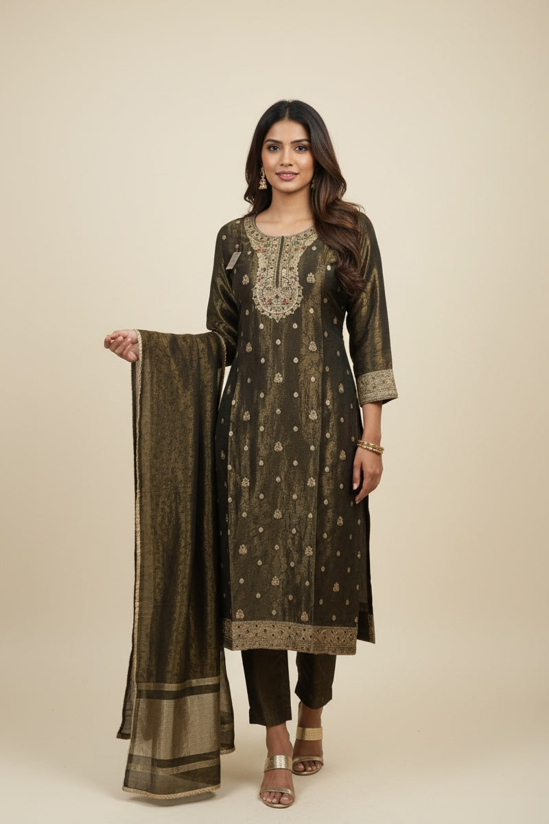 Embrace sophisticated style with this stunning Olive Green Embroidered Kurta Set that beautifully blends traditional artistry with contemporary design. This luxurious ensemble features intricate golden embroidery and a regal color palette that exudes elegance and grace.