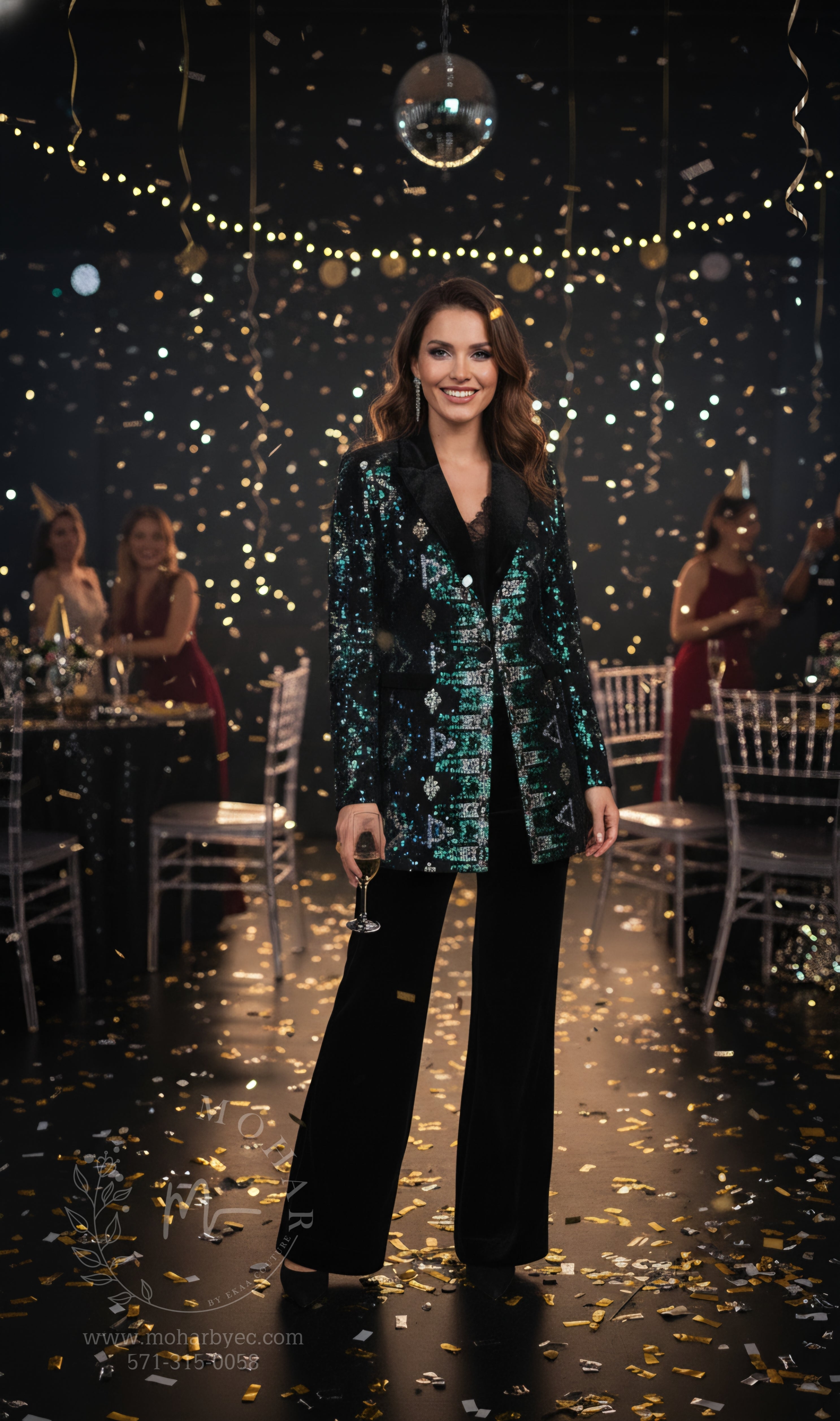 This versatile ensemble offers multiple styling options. Wear all three pieces together for maximum impact, or style the sequined jacket over a simple camisole for a different look. The black velvet base makes it easy to accessorize—pair with statement earrings, sleek heels, and a metallic clutch. Keep jewelry minimal to let the sequined jacket take center stage, or add bold pieces for extra drama.