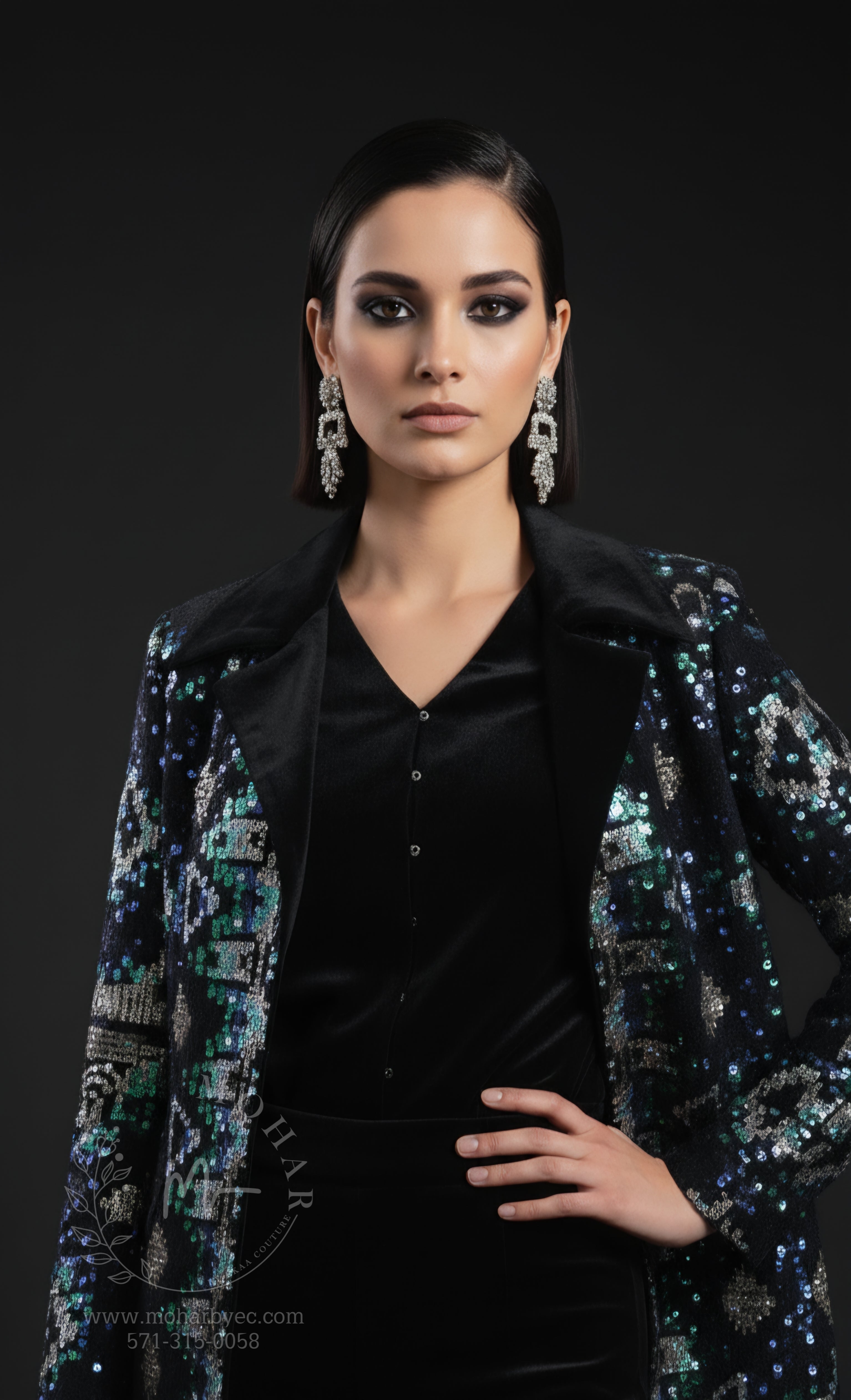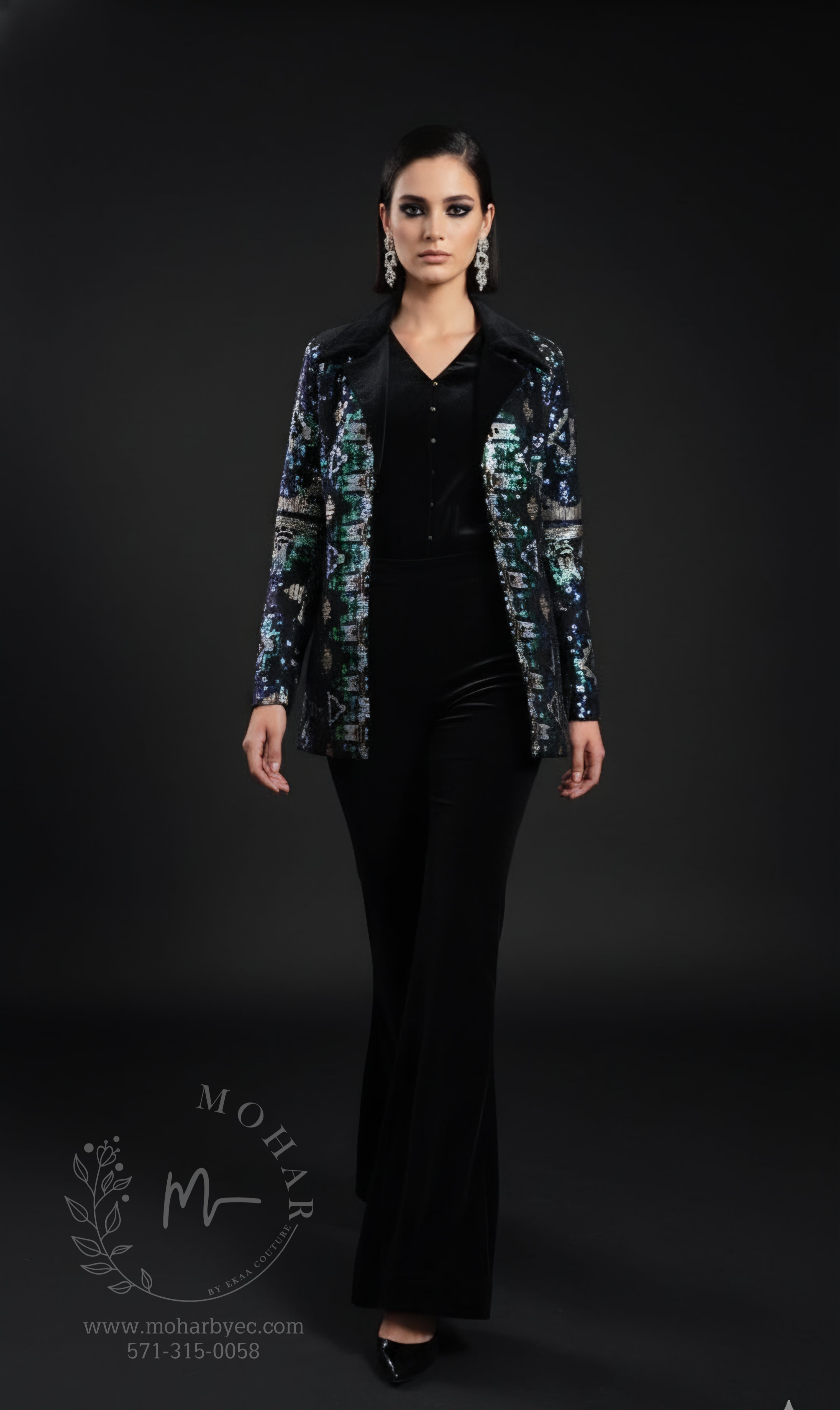The star of this ensemble is the exquisitely embellished jacket, featuring a mesmerizing pattern of blue, green, and silver sequins that create an abstract, artistic design. The open-front style allows you to showcase the velvet shirt underneath while making a bold statement. Perfect for layering and creating dimension in your look.