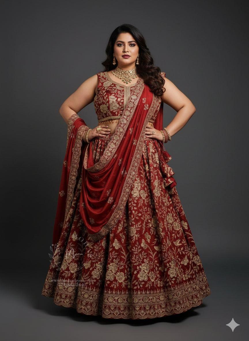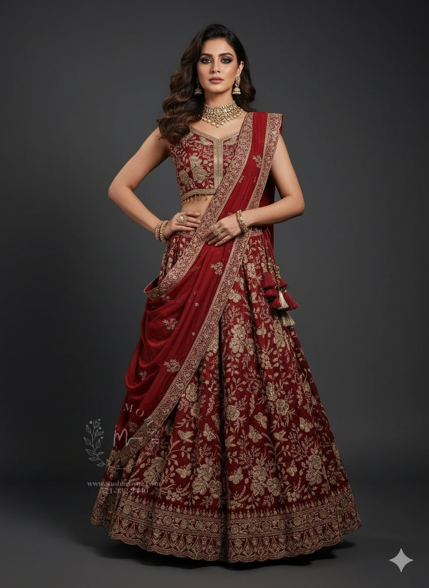 Deep Maroon Silk Thread Embroidered Lehenga Choli